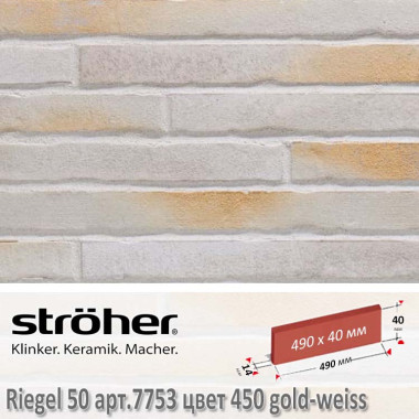 Цвет модели Riegel 50 7753.450 gold-weiss - бело-золотой; поверхность - шероховатая. Подходит для фасадов и цоколей зданий, может применяться при внутренней отделке помещений. Оттенок можно усилить или разбавить, используя затирку различных цветов.