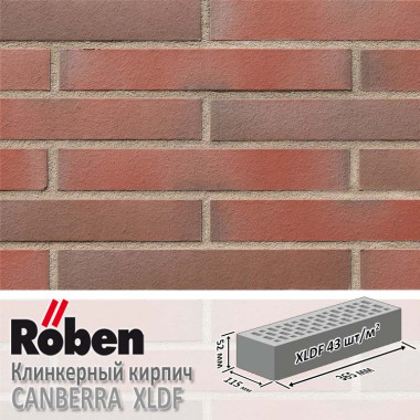 Облицовочный клинкерный кирпич ROBEN коллекции CANBERRA представлен в пестром красно-коричневом цвете, имеет гладкую поверхность, формат XLDF (365х115х52 мм), где ложковая часть - 365 х 52 мм, а тычковая сторона 115х52 мм. Глубина кирпича составляет 115 мм. При таких размерах средний расход при ложковой кладке составляет 43 шт/м2 с учетом кладочного шва в 10-12 мм. При изменении ширины кладочного шва расход кирпича изменится. (Справочно: при выполнении облицовочной кладки оптимальной толщиной шва является 12 мм согласно строительным нормам).