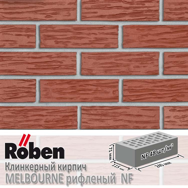 Облицовочный клинкерный кирпич ROBEN коллекции MELBOURNE представлен в ярком красном цвете, имеет рельефную поверхность, формат NF (240х115х71 мм), где ложковая часть - 240 х 71 мм, а тычковая сторона 115х71 мм. Глубина кирпича составляет 115 мм. При таких размерах средний расход при ложковой кладке составляет 48 шт/м2 с учетом кладочного шва в 10-12 мм. При изменении ширины кладочного шва расход кирпича изменится. (Справочно: при выполнении облицовочной кладки оптимальной толщиной шва является 12 мм согласно строительным нормам).