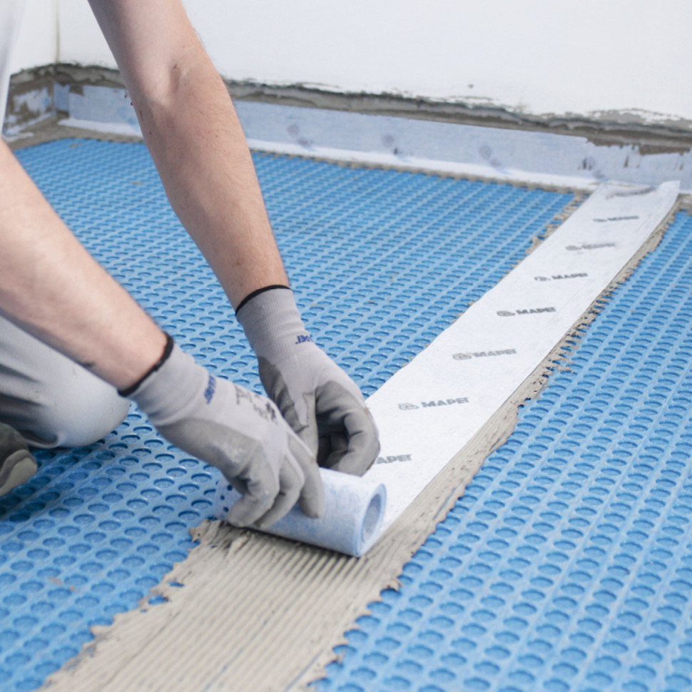 Необходимо нанести слой гидроизоляционного материала по периметру деформационных швов, а также по краям и углам, уложить ленту, удостоверившись в том, что она расположена правильно, не имеет складок и воздушных пузырей. Если Мапебанд ИР используется для деформационных швов в стяжке, то она должна располагаться непосредственно над швами. Соединения лент Мапебанд ИР должны иметь нахлест не менее 5 см и приклеиваться с помощью выбранного гидроизоляционного материала. После укладывания ленты можно приступать к нанесению гидроизоляции. Гидроизоляционный материал наносится сплошным слоем поверх Mapeband Easy R или с разрывом для возможности совмещения шва в плитке с центром ленты. При армировании слоя гидроизоляции сеткой Mapenet 150 R деформационный шов не армируется, необходимо укладывать сетку до края шва.
