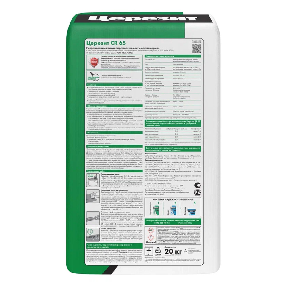 Жесткая цементная обмазочная гидроизоляция Церезит CR 65 мешок 20 кг
