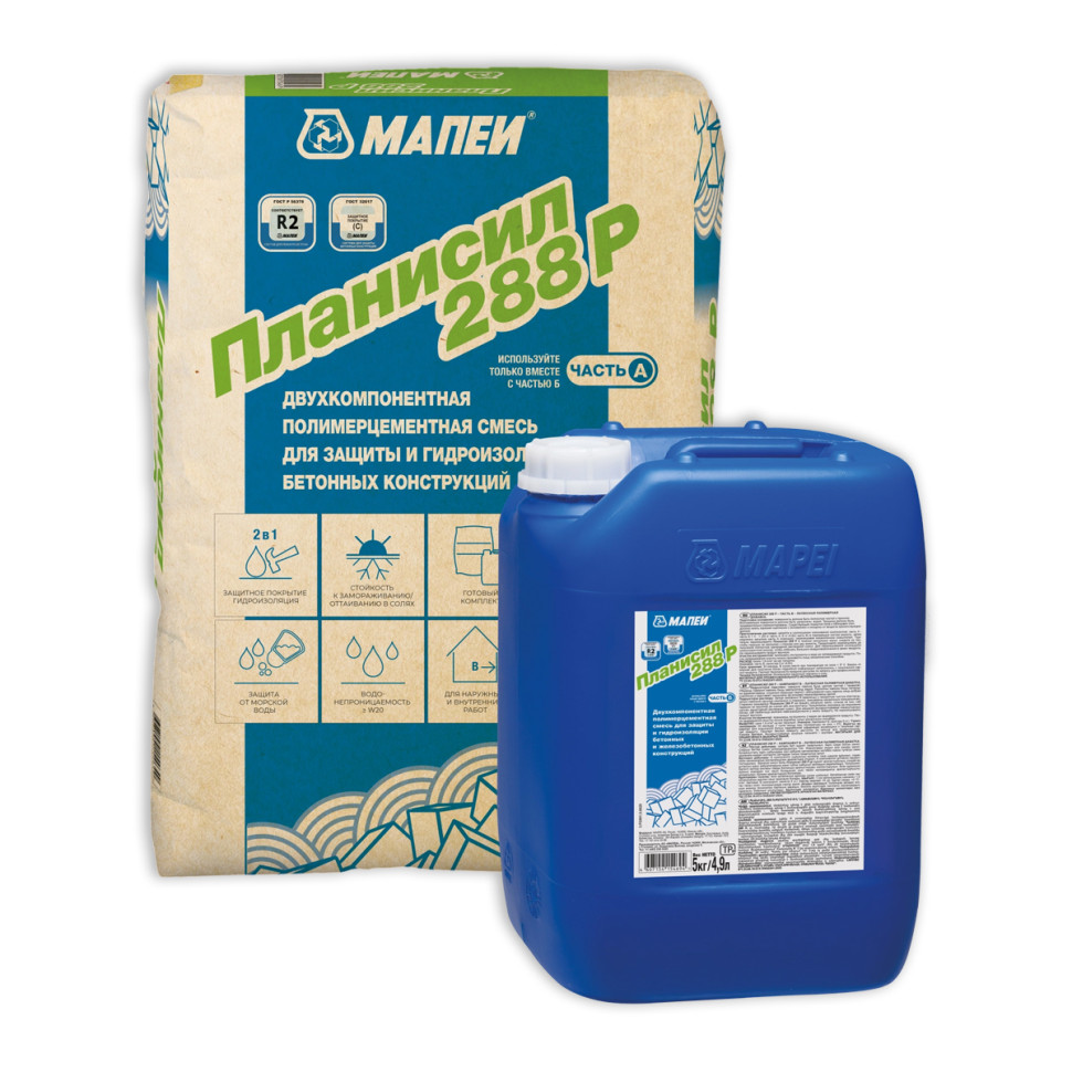 Полимерцементная гидроизоляция и ремонтный состав Mapei Планисил 288 Р представляет собой 2-компонентный состав на основе цементного вяжущего и функциональных наполнителей (компонент А, мешок 20 кг) и водной дисперсии синтетических полимеров (компонент Б, канистра 5 кг). При смешивании компонентов образуется жидкая смесь, которая наносится на основания с помощью кисти, валика, шпателя или механическим распылением. Применяется для защиты и гидроизоляции бетонных и железобетонных конструкций от воздействия воды, углекислого газа и солевых реагентов. Mapei Планисил 288 Р имеет превосходную адгезию к строительным основаниям и обеспечивает надёжную защиту и гидроизоляцию. Состав удобен в работе - предварительно дозированный комплект исключает ошибки при приготовлении. Затвердевший раствор Mapei Планисил 288 Р имеет показатель водонепроницаемости W18, обладая при этом высокой паропроницаемостью.