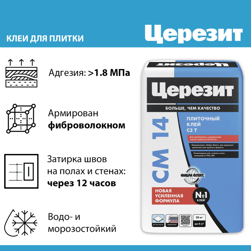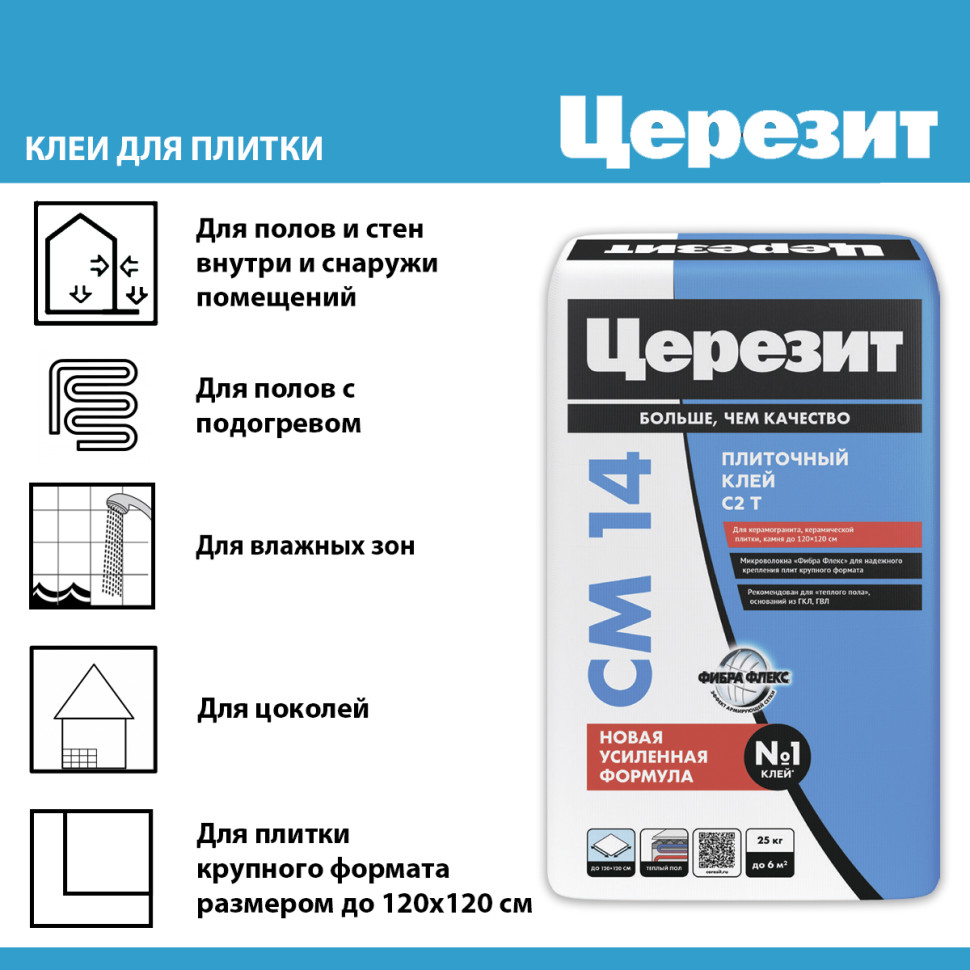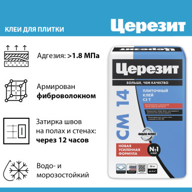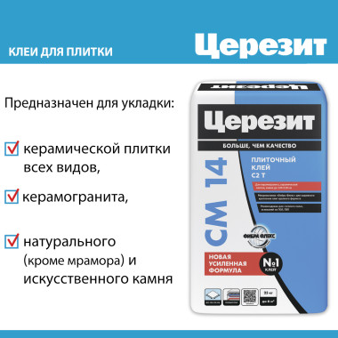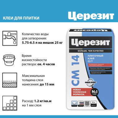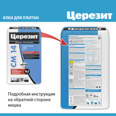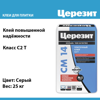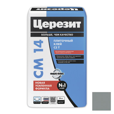 Клей для плитки Ceresit CM 14 – цементный клей с улучшенной адгезией на основе серого цемента, который относится к классу C2 T (C2 - цементный с улучшенными характеристиками и высокой адгезией; T – тиксотропный или стойкий к оползанию). Усилен армирующими волокнами Fibre Force, которые добавляют клею прочности и эластичности. Предназначен для выполнения плиточных работ как внутри помещений, так и для уличной облицовки, особенно оправдывая свои характеристики при работах с крупной плиткой формата до 120х120 см, идеален для плит самого популярного формата 120х60 см. Также допускается для работ с горизонтальными поверхностями, которые будут подвергаться бытовым нагрузкам. Допускается укладки плитки на стяжках с подогревом. Слой нанесения не должен превышать 15 мм.