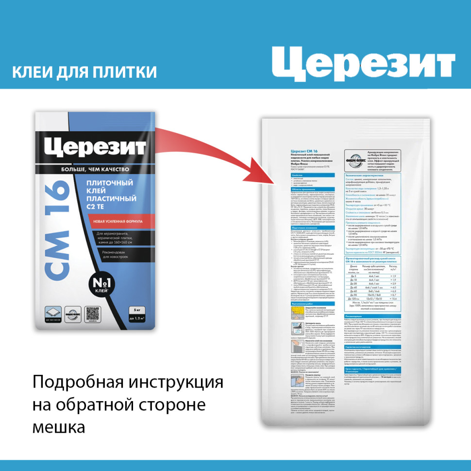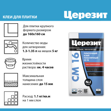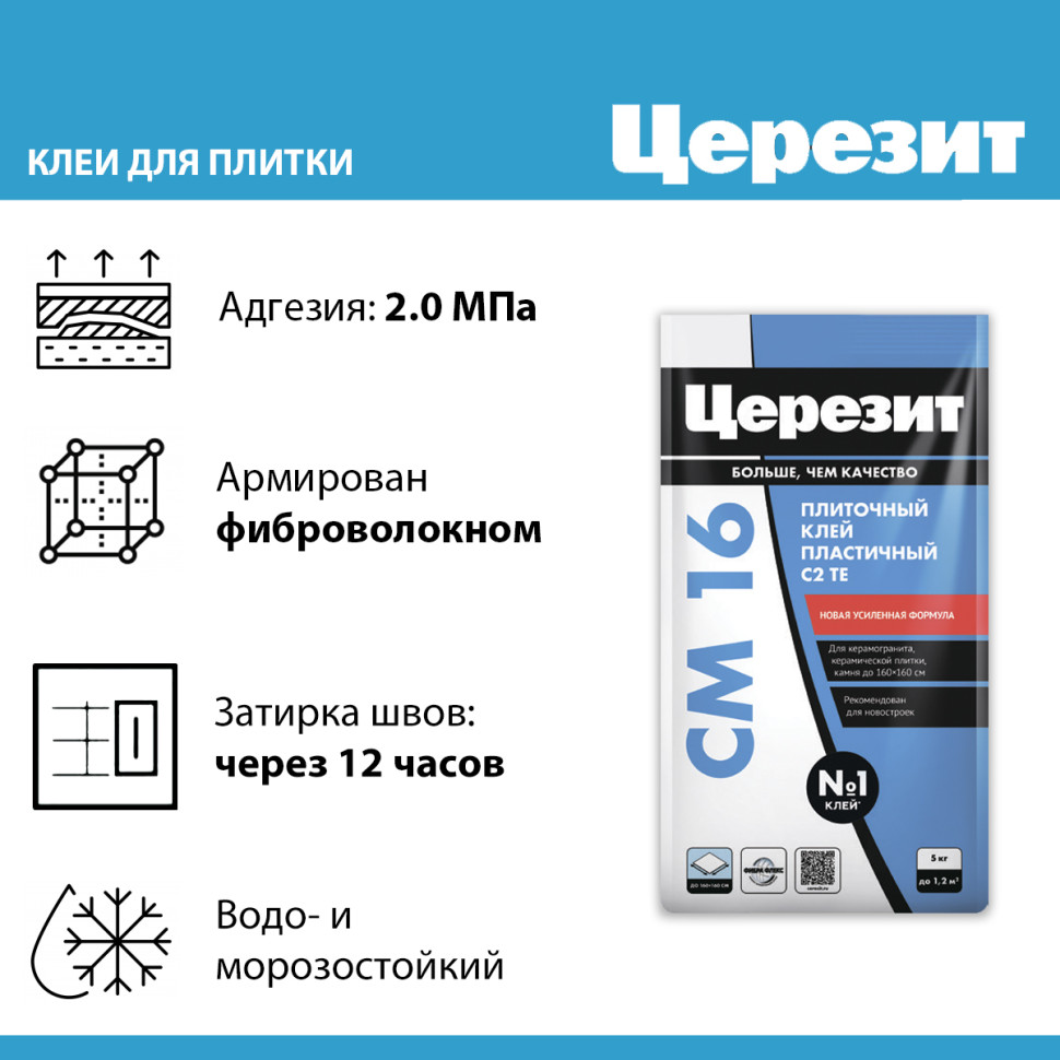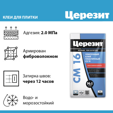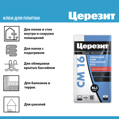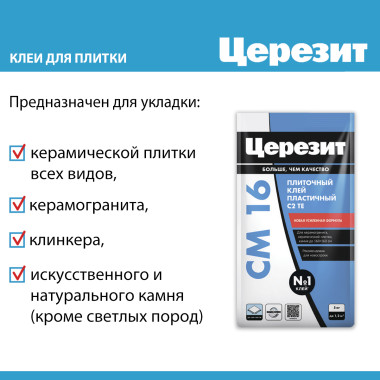 Клей для плитки Ceresit CM 16 – цементный клей с повышенными показателями адгезии и высокой эластичностью, который относится к классу C2 TE (C2 - цементный с увеличенной адгезией; T – тиксотропный или стойкий к оползанию; E – с увеличенными открытым временем). Предназначен для выполнения плиточных работ со всеми типами керамической плитки, керамогранитом, клинкером, а также натуральным (кроме светлых пород) и искусственным камнем форматом до 160х160 см. Подходит для работ как внутри помещений, так и для уличной облицовки. Клей Церезит СМ 16 считается эластичным за счет введения в его состав армирующих волокон Fibre Force, но по своим показателям он немного не дотягивает до присвоения ему дополнительного класса S1. Подойдет для укладки плитки на систему "теплый пол" без введения дополнительных пластификаторов, для облицовки фасада, цоколя, балконов, террас, входных групп и крытых бассейнов.
