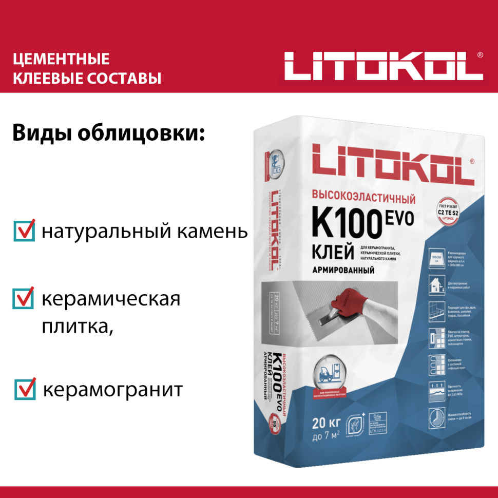 Плиточный клей Литокол К 100 незаменим в случаях, когда Вы имеете дело с плитами керамогранита или натурального камня особо крупного формата (длина стороны более метра). Этот состав также следует купить, если перед перед Вами стоит задача облицевать фасад дома клинкером, натуральным камнем (стойким к воздействию воды и влаги), крупноформатным керамогранитом. Следует обратить внимание на то, что при работе с облицовочным материалом крупного формата, а также при выполнении работ на промышленных объектах с высокими нагрузками, и при выполнении фасадных работ рекомендуется укладывать плитку методом "двойного нанесения" клеевого состава (клей для плитки наносится как на основание, так и на тыльную сторону плитки). Безусловно, данный плиточный клей можно применять и для выполнения бытовых задач, он также продемонстрирует максимальную долговечность и прочность.