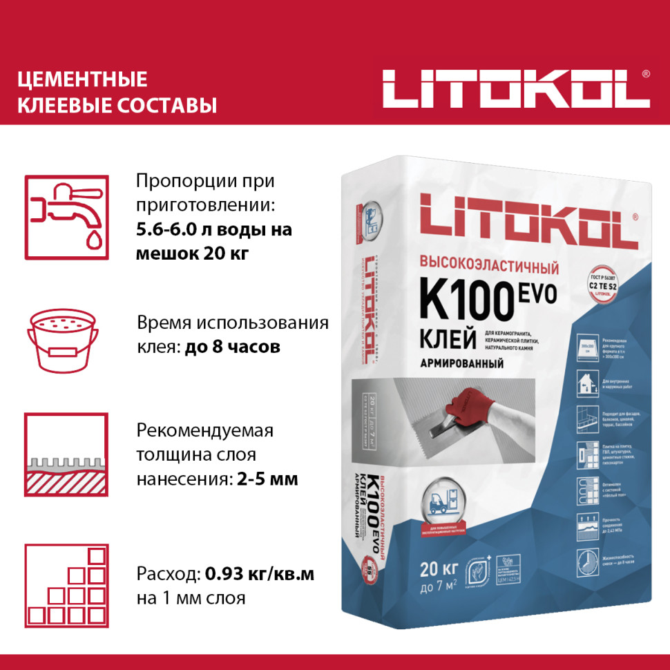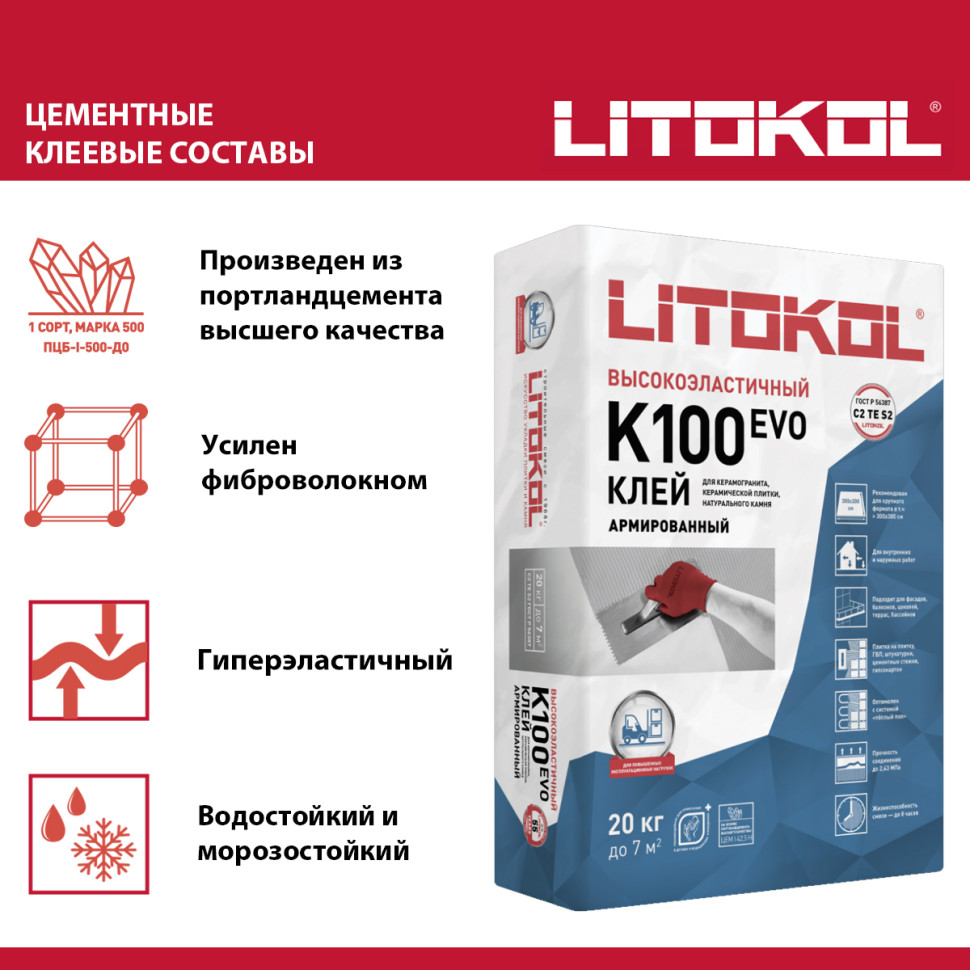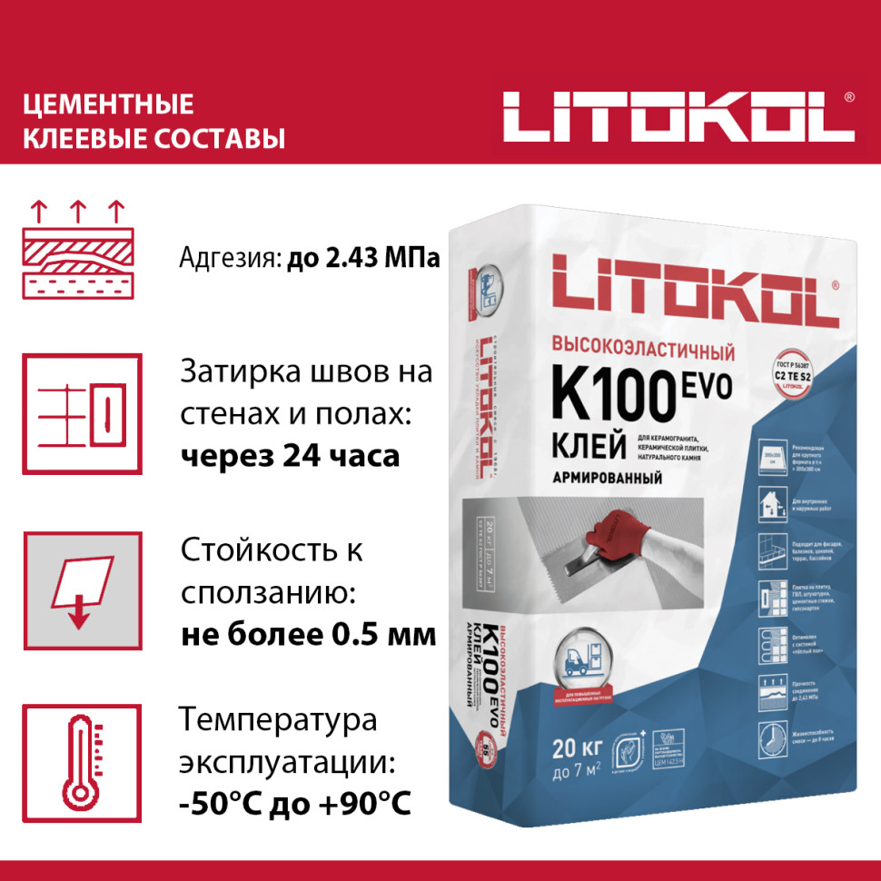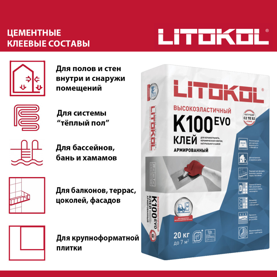 Клей для плитки Litokol Hyperflex K100 – высокоадгезивный и высокоэластичный цементный клей на основе серого цемента, который относится к классу C2 TE S2 (C2 - цементный с улучшенной адгезией; T – тиксотропный или стойкий к оползанию; E – с увеличенным открытым временем; S2 – высокодеформативный). Разработан для укладки всех видов плитки на сложных, подверженных деформациям и внутренним напряжениям основаниям (перепадам температур и влажности, механическим и вибрационным нагрузкам). Идеален для укладки плитки особо крупного формата со стороной более 120 см - высокая деформативная способность снимает возникающие внутренние напряжения между основанием и крупноформатной облицовкой, минимизируя риск образования трещин. Также данный плиточный клей рекомендуется к применению при укладке плитки в зонах с высокой проходимостью - таких как здания аэропортов, вокзалов, промышленных предприятий, складских помещениях, торговых центрах. Высокая деформативность и высокая адгезия клея позволяет выполнить плиточные работы при наружной отделке фасадов и террас, активно подвергающимся температурно-влажностным нагрузкам. Подходит для укладки плитки в системах "теплый пол". Увеличенное открытое время раствора позволяет нанести клей на основание, а потом без риска ухудшения характеристик, укладывать плитку. Это особенно актуально при выполнении масштабных работ. Подходит для укладки плитки в системах теплый пол, для облицовки бассейнов, для облицовки фасадов крупноформатными плитами.