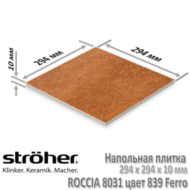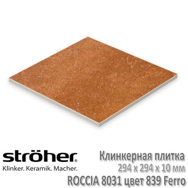 Клинкерная напольная плитка Stroher серии Roccia в цвете 839 Ferro (медно-коричневый с отливом, прожилками и включениями керамических гранул) имеет толщину в 10 мм и размеры 294 х 294 мм. Имеет коэффициент антискольжения R10 (не скользит при ходьбе в обуви и босиком), что раскрывает возможности применения как внутри помещений, так и на улице без риска поскользнуться даже в осенне-зимний период. При укладке рекомендуется соблюдать шов в 3-5 мм. Швы заполняются затирками для плитки.
