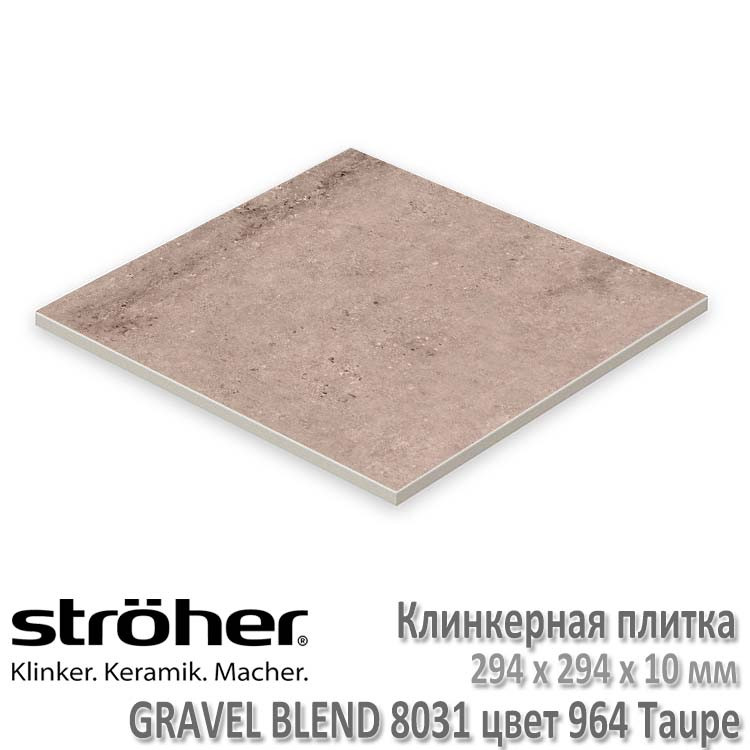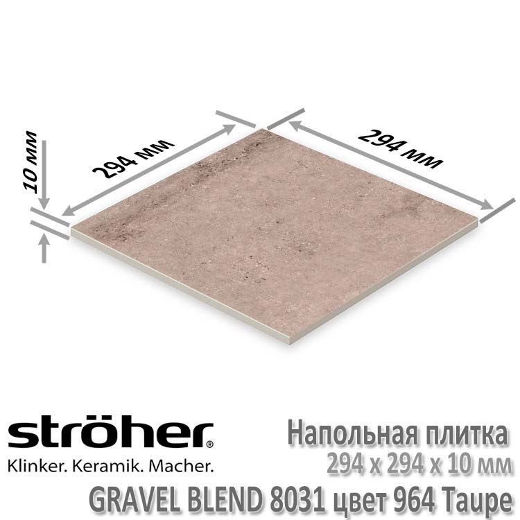 Клинкерная напольная плитка Stroher серии Gravel Blend в цвете 964 Taupe (серо-коричневый мрамор с вкраплениями и прожилками) имеет толщину в 10 мм и размеры 294 х 294 мм. Имеет коэффициент антискольжения R10 (не скользит при ходьбе в обуви и босиком), что раскрывает возможности применения как внутри помещений, так и на улице без риска поскользнуться даже в осенне-зимний период. При укладке рекомендуется соблюдать шов в 3-5 мм. Швы заполняются затирками для плитки.