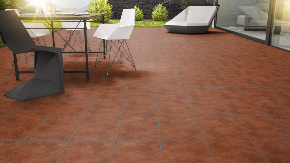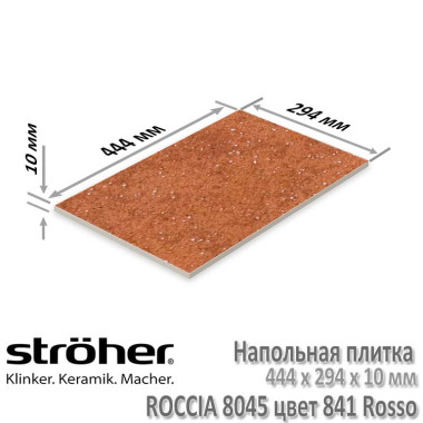 Клинкерная напольная плитка Stroher серии Roccia в цвете 841 Rosso (красно-коричневый с отливом, прожилками и включениями керамических гранул) имеет толщину в 10 мм и размеры 444 х 294 мм. Имеет коэффициент антискольжения R10 (не скользит при ходьбе в обуви и босиком), что раскрывает возможности применения как внутри помещений, так и на улице без риска поскользнуться даже в осенне-зимний период. При укладке рекомендуется соблюдать шов в 3-5 мм. Швы заполняются затирками для плитки.
