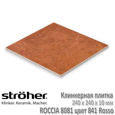 Клинкерная напольная плитка Stroher серии Roccia в цвете 841 Rosso (красно-коричневый с отливом, прожилками и включениями керамических гранул) имеет толщину в 10 мм и размеры 240 х 240 мм. Имеет коэффициент антискольжения R10 (не скользит при ходьбе в обуви и босиком), что раскрывает возможности применения как внутри помещений, так и на улице без риска поскользнуться даже в осенне-зимний период. При укладке рекомендуется соблюдать шов в 3-5 мм. Швы заполняются затирками для плитки.