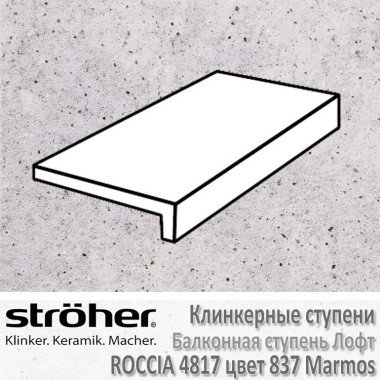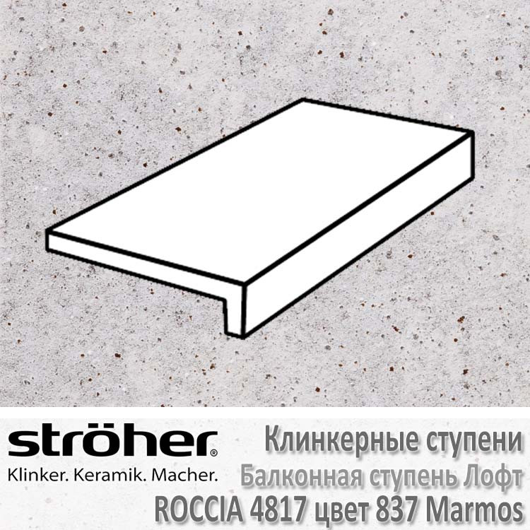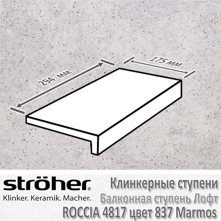 Клинкерная балконная ступень Stroher серии Roccia в цвете 837 Marmos (бело-серый с отливом, прожилками и включениями керамических гранул) имеет форму Лофт (прямой капинос), толщину в 10 мм и размеры 294 х 175 мм. При этом – 294 мм – это рядовая ширина, а 175 мм – это глубина ступени (уменьшенная глубина балконных ступеней позволяет широко применять их при облицовке балконных выступов, террас). Имеет коэффициент антискольжения R10 (не скользит при ходьбе в обуви), что раскрывает возможности применения как внутри помещений, так и на улице без риска поскользнуться даже в осенне-зимний период. При укладке рекомендуется соблюдать шов в 3-5 мм. Швы заполняются затирками для плитки.