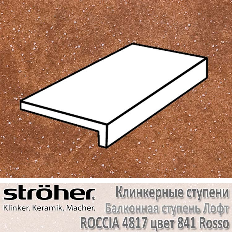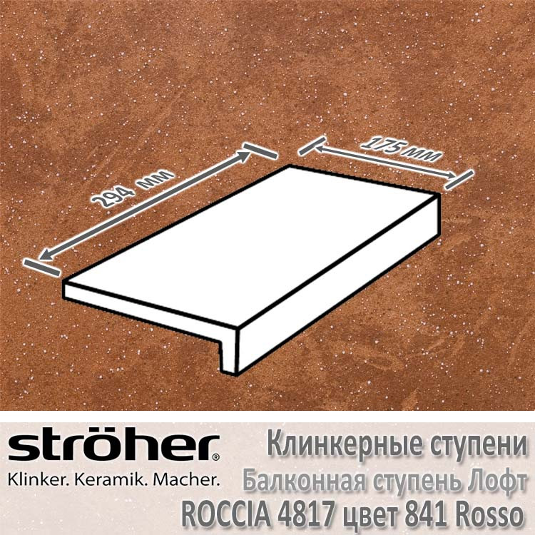 Клинкерная балконная ступень Stroher серии Roccia в цвете 841 Rosso (красно-коричневый с отливом, прожилками и включениями керамических гранул) имеет форму Лофт (прямой капинос), толщину в 10 мм и размеры 294 х 175 мм. При этом – 294 мм – это рядовая ширина, а 175 мм – это глубина ступени (уменьшенная глубина балконных ступеней позволяет широко применять их при облицовке балконных выступов, террас). Имеет коэффициент антискольжения R10 (не скользит при ходьбе в обуви), что раскрывает возможности применения как внутри помещений, так и на улице без риска поскользнуться даже в осенне-зимний период. При укладке рекомендуется соблюдать шов в 3-5 мм. Швы заполняются затирками для плитки.