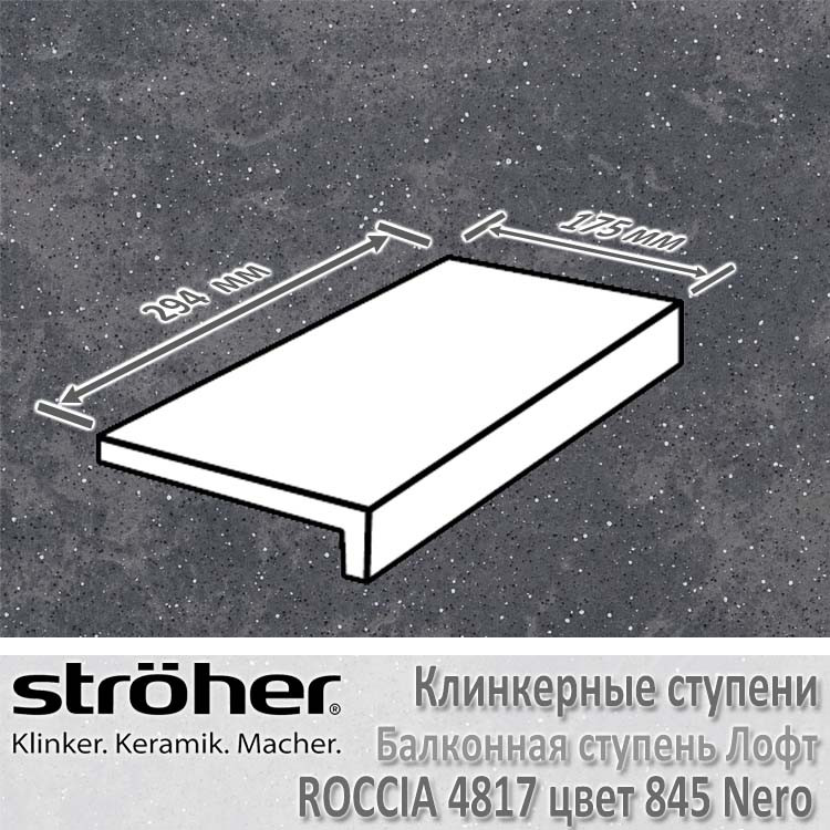 Клинкерная балконная ступень Stroher серии Roccia в цвете 845 Nero (черно-серый с отливом, прожилками и включениями керамических гранул) имеет форму Лофт (прямой капинос), толщину в 10 мм и размеры 294 х 175 мм. При этом – 294 мм – это рядовая ширина, а 175 мм – это глубина ступени (уменьшенная глубина балконных ступеней позволяет широко применять их при облицовке балконных выступов, террас). Имеет коэффициент антискольжения R10 (не скользит при ходьбе в обуви), что раскрывает возможности применения как внутри помещений, так и на улице без риска поскользнуться даже в осенне-зимний период. При укладке рекомендуется соблюдать шов в 3-5 мм. Швы заполняются затирками для плитки.