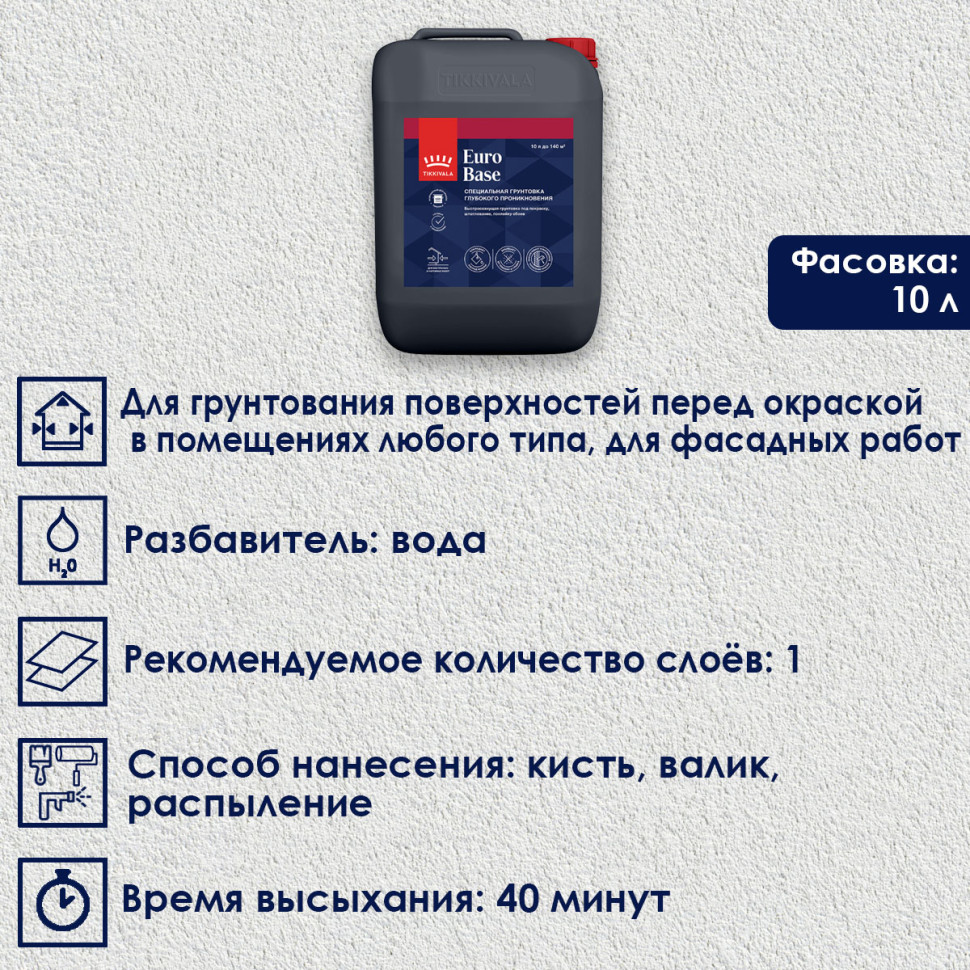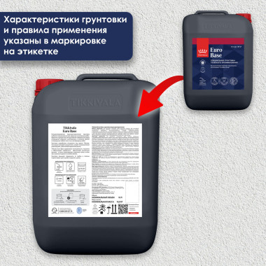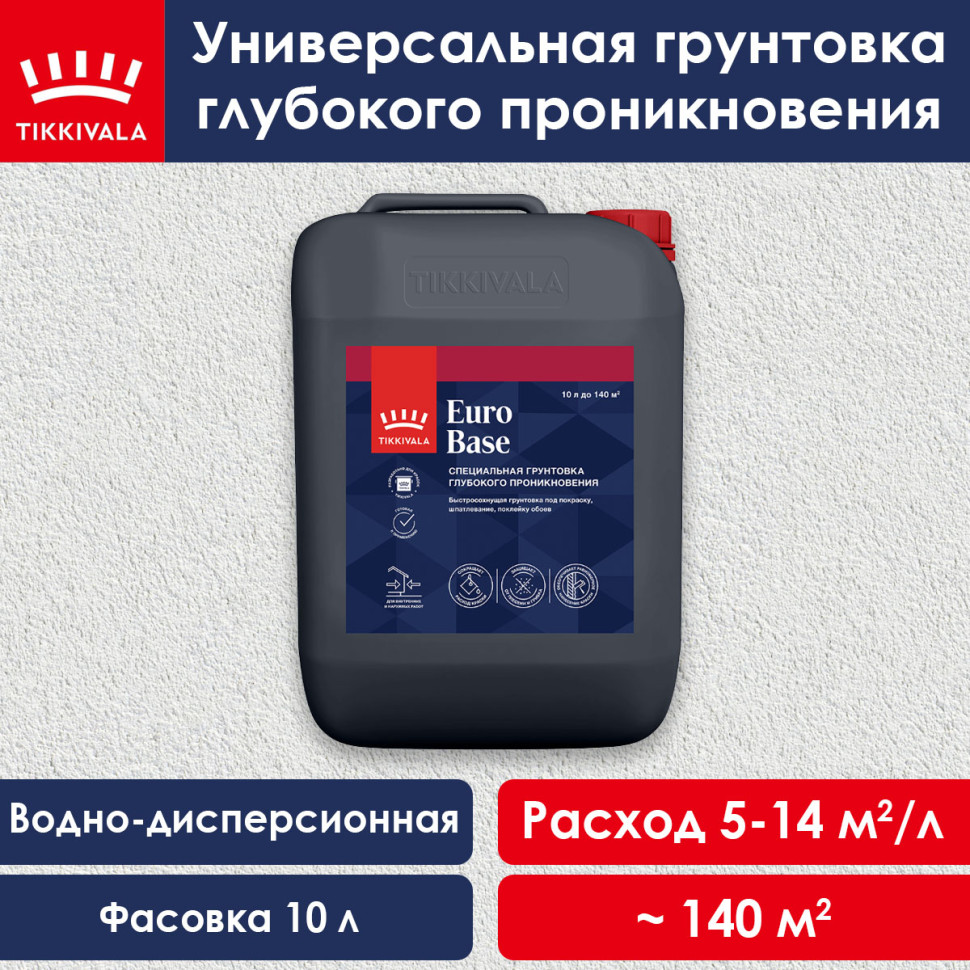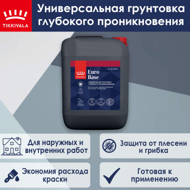 Tikkivala Euro Base – это готовый к применению специализированный водно-дисперсионный грунт глубокого проникновения для наружных и внутренних работ. Превосходно зарекомендовал себя для профессионального использования на объектах с высокими требованиями к качеству и стойкости отделки любых поверхностей жилых и коммерческих помещений. Использование грунтовки Euro Base существенно сокращает расход отделочных материалов и увеличивает срок службы покрытия в целом. Рекомендован для подготовки оснований перед финишной отделкой - нанесением краски и оклейкой обоями в помещениях любого типа влажности и назначения, а также при фасадных работах.