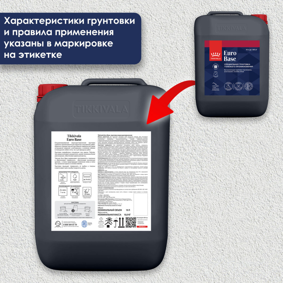 Грунтовка Tikkivala Euro Base поставляется в канистрах объёмом 10 л. Рекомендовано 1-слойное нанесение с помощью кисти, валика или распылением. Расход грунтовки зависит от шероховатости и впитывающей способности основания, а также способа нанесения и составляет 5-14 кв.м/л. Канистры объёмом 10 л может хватить на покрытие площади до 140 кв.м за 1 проход.