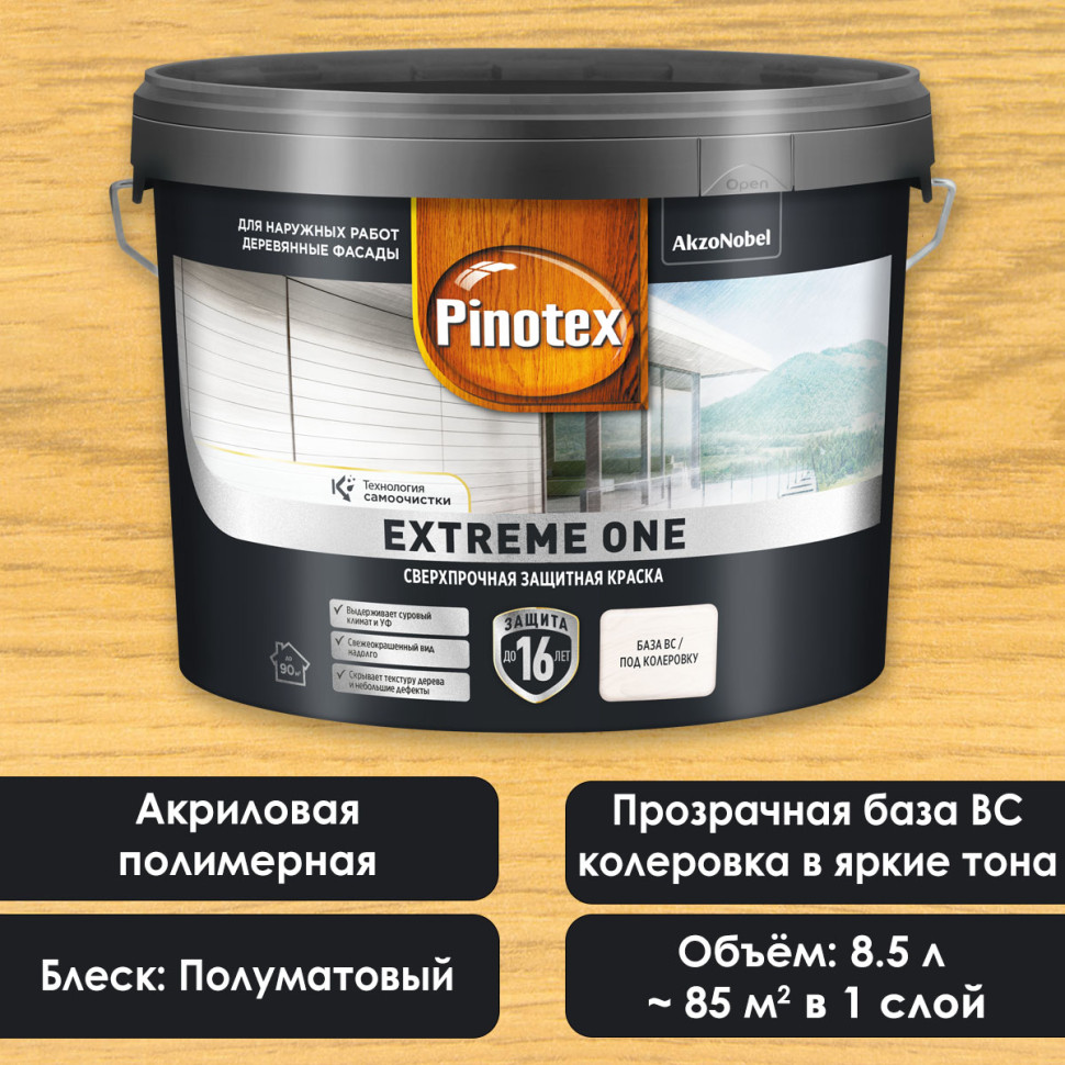 Pinotex Extreme One - сверхпрочная защитная краска для древесины на водной основе (дисперсия акрилового полимера). Годна для обработки деревянных строений, вертикальных поверхностей (окон, дверей), также применяется для защиты минеральных оснований (бетонных, каменных, кирпичных) в условиях сурового климата. Рекомендуется для отделки хвойных и лиственных пород древесины, может применяться как по новым, так и по ранее окрашенным масляными и водными красками основаниям. Образует высокопрочное эластичное покрытие, устойчивое к растрескиванию и расслаиванию. Содержит добавки против синевы и плесени. Благодаря уникальной технологии самоочистки, загрязнения смываются дождём и поверхность долгое время имеет свежеокрашенный вид. Краска Pinotex Extreme One имеет полуматовый блеск, скрывает текстуру и небольшие недостатки поверхности. На водной основе, имеет нейтральный запах, легко наносится и быстро сохнет.
