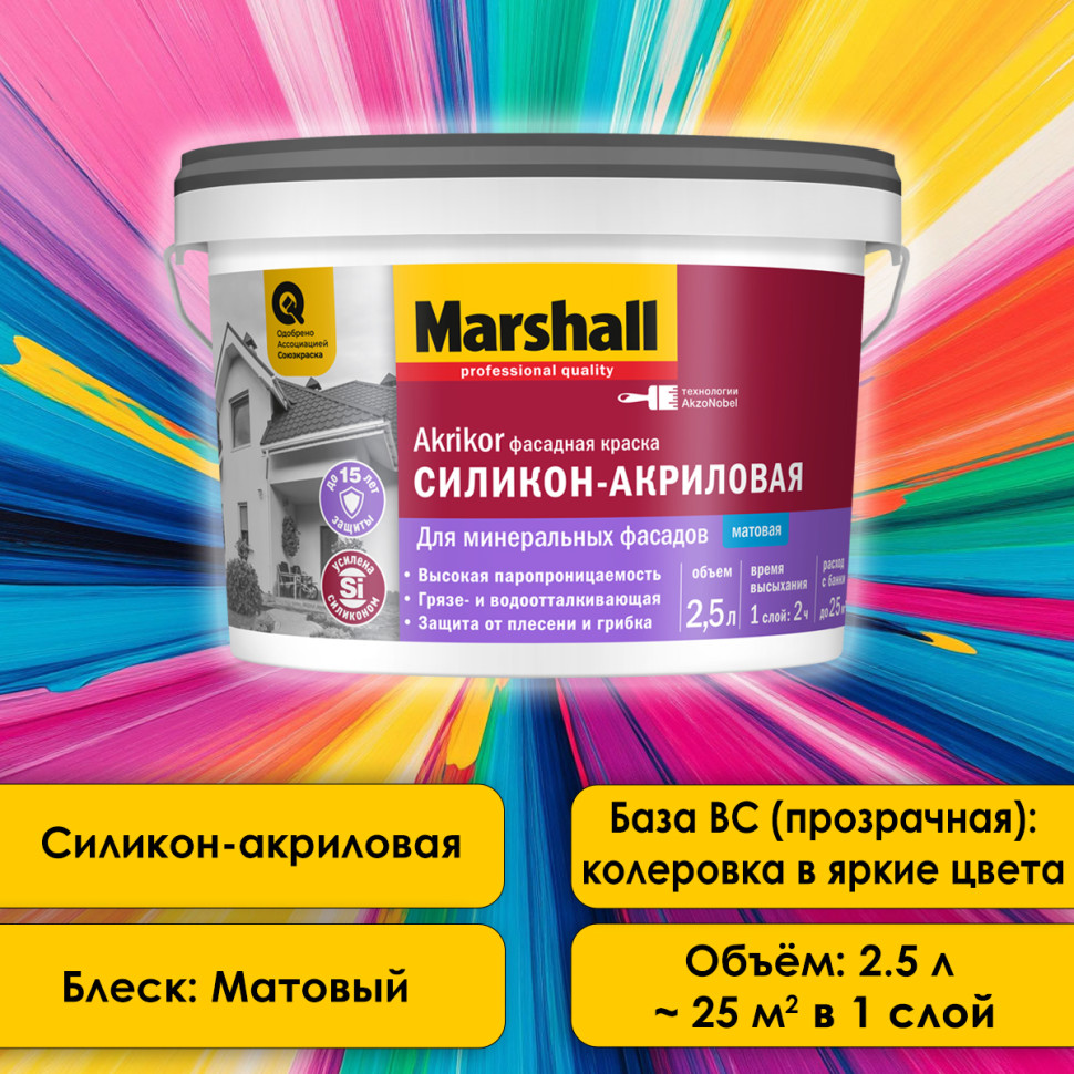 Marshall Akrikor фасадная - матовая силикон-акриловая краска для наружных работ. Предназначена для высококачественной отделки минеральных фасадов зданий. В состав краски входит силикон, благодаря чему поверхности надёжно защищены от грязи и влаги. Применяется на следующих основаниях: бетон, штукатурка, кирпичная и каменная кладка, оштукатуренные системы утепления ("Мокрый фасад"). Краска содержит добавки, препятствующие развитию плесени и грибка. Поверхности, окрашенные Marshall Akrikor фасадная, отличаются высокой паропроницаемостью, износостойкостью, атмосферостойкостью - производитель гарантирует 15 лет службы покрытия. Краска легко наносится, имеет экономный расход.