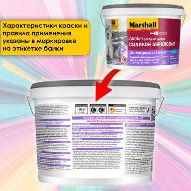 Marshall Akrikor фасадная - матовая силикон-акриловая краска для наружных работ. Предназначена для высококачественной отделки минеральных фасадов зданий. В состав краски входит силикон, благодаря чему поверхности надёжно защищены от грязи и влаги. Применяется на следующих основаниях: бетон, штукатурка, кирпичная и каменная кладка, оштукатуренные системы утепления ("Мокрый фасад"). Краска содержит добавки, препятствующие развитию плесени и водорослей. Поверхности, окрашенные Marshall Akrikor фасадная, отличаются высокой паропроницаемостью, износостойкостью, атмосферостойкостью - производитель гарантирует 15 лет службы покрытия. Краска легко наносится, имеет экономный расход.
