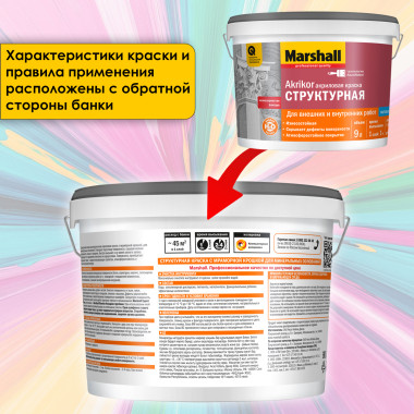 Marshall Akrikor Структурная - матовая водно-дисперсионная акриловая краска для наружных и внутренних работ. В состав краски входит мраморная крошка, благодаря чему создаётся эффект объёмной, фактурной поверхности, кроме того скрываются мелкие дефекты оснований - сколы, небольшие трещины и неровности. Предназначена для высококачественной отделки фасадов зданий и стен внутри помещений. Наносится на следующие минеральные основания: бетон, оштукатуренные поверхности, кирпичная и каменная кладка, гипсокартон. Краска содержит добавки, препятствующие развитию плесени и водорослей. Поверхности, окрашенные Marshall Akrikor Структурная отличаются превосходной износостойкостью, устойчивостью к атмосферным и механическим воздействиям, имеют водо- и грязеотталкивающие свойства.