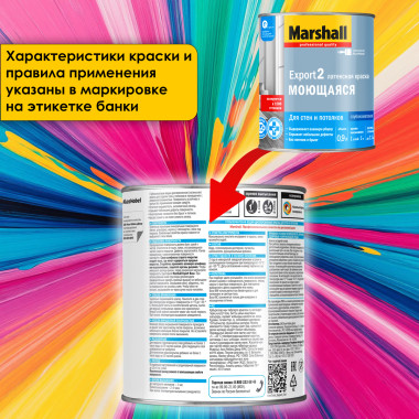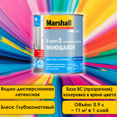 Marshall Export-2 - глубокоматовая водно-дисперсионная латексная краска для внутренних работ в помещениях любого типа влажности (кроме ванных комнат и душевых). Предназначена для высококачественной отделки стен и потолков, окрашивания обоев всех видов - стеклообоев, флизелиновых, виниловых, структурированных и текстурированных. Наносится на следующие минеральные основания: бетон, оштукатуренные поверхности, кирпичная кладка, гипсокартон, дерево. Краска на водной основе, поэтому не имеет резкого запаха, содержит латекс, благодаря чему выдерживает влажную уборку. Marshall Export-2 отличается тиксотропностью (не стекает с вертикальных поверхностей и не образует брызг), хорошей укрывистостью, что обеспечивает экономный расход материала и скрывает мелкие дефекты поверхностей.