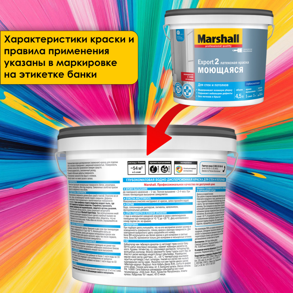 Marshall Export-2 - глубокоматовая водно-дисперсионная латексная краска для внутренних работ в помещениях любого типа влажности (кроме ванных комнат и душевых). Предназначена для высококачественной отделки стен и потолков, окрашивания обоев всех видов - стеклообоев, флизелиновых, виниловых, структурированных и текстурированных. Наносится на следующие минеральные основания: бетон, оштукатуренные поверхности, кирпичная кладка, гипсокартон, дерево. Краска на водной основе, поэтому не имеет резкого запаха, содержит латекс, благодаря чему выдерживает влажную уборку. Marshall Export-2 отличается тиксотропностью (не стекает с вертикальных поверхностей и не образует брызг), хорошей укрывистостью, что обеспечивает экономный расход материала и скрывает мелкие дефекты поверхностей.