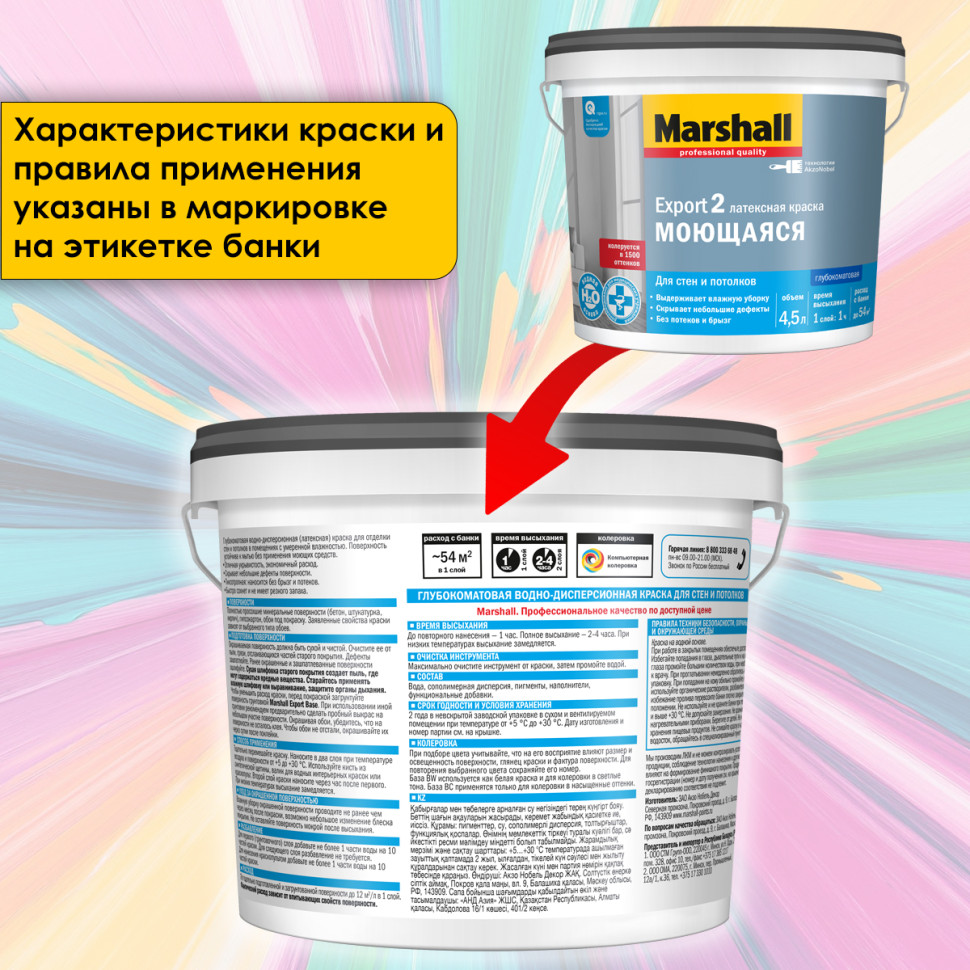 Marshall Export-2 - глубокоматовая водно-дисперсионная латексная краска для внутренних работ в помещениях любого типа влажности (кроме ванных комнат и душевых). Предназначена для высококачественной отделки стен и потолков, окрашивания обоев всех видов - стеклообоев, флизелиновых, виниловых, структурированных и текстурированных. Наносится на следующие минеральные основания: бетон, оштукатуренные поверхности, кирпичная кладка, гипсокартон, дерево. Краска на водной основе, поэтому не имеет резкого запаха, содержит латекс, благодаря чему выдерживает влажную уборку. Marshall Export-2 отличается тиксотропностью (не стекает с вертикальных поверхностей и не образует брызг), хорошей укрывистостью, что обеспечивает экономный расход материала и скрывает мелкие дефекты поверхностей.