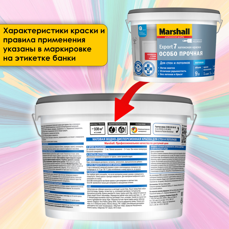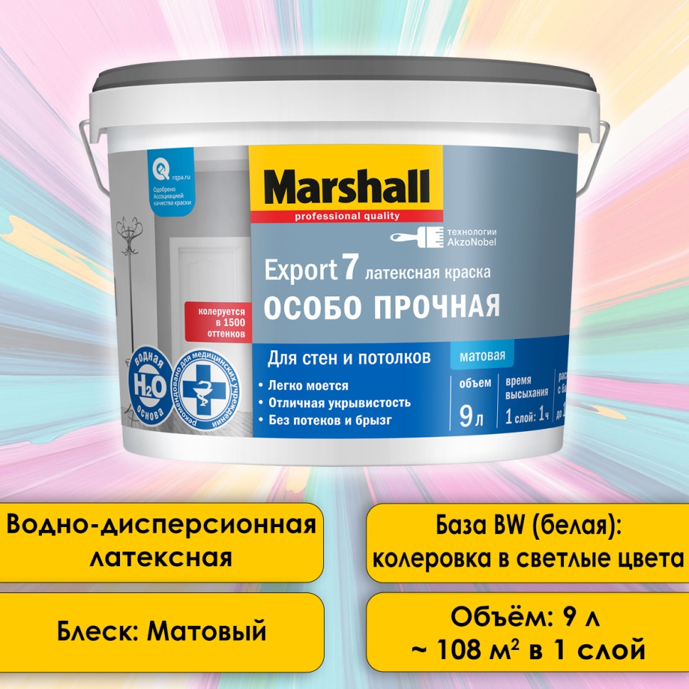 Marshall Export-7 - матовая водно-дисперсионная латексная краска для внутренних работ в помещениях с умеренной влажностью. Предназначена для высококачественной отделки стен и потолков, образует покрытие, обладающее высокими декоративными свойствами, подчёркивая фактуру основания - штукатурки, лепнины, обоев. Наносится на следующие основания: бетон, оштукатуренные поверхности, кирпичная кладка, гипсокартон, обои под покраску. Краска на водной основе, поэтому не имеет резкого запаха, содержит латекс, благодаря чему выдерживает влажную уборку мягкими моющими средствами. Marshall Export-7 отличается тиксотропностью (не стекает с вертикальных поверхностей и не образует брызг), хорошей укрывистостью, что обеспечивает экономный расход материала.