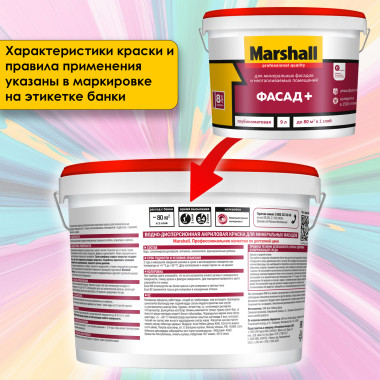 Marshall Фасад+ - глубокоматовая водно-дисперсионная краска на акриловой основе для наружных и внутренних работ. Предназначена для высококачественной отделки минеральных фасадов зданий, а также интерьеров и неотапливаемых помещений, таких как гаражи, подвалы, балконы. Применяется на следующих основаниях: бетон, штукатурка, кирпичная кладка. Образует паропроницаемое покрытие, устойчивое к атмосферным воздействиям - снегу, дождю, ультрафиолету. Поверхности, окрашенные Marshall Фасад+, имеют высокую износостойкость, отличные грязеотталкивающие свойства, устойчивость к мытью без применения моющих средств. Краска легко, без потёков наносится на вертикальные и горизонтальные поверхности, зрительно выравнивает основания, имеет хорошее открытое время и экономный расход.
