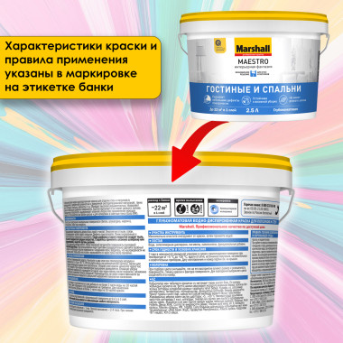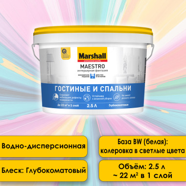 Marshall Maestro Интерьерная Фантазия - глубокоматовая водно-дисперсионная латексная краска для внутренних работ в помещениях с умеренной влажностью. Предназначена для высококачественной отделки стен и потолков в гостиных, спальнях, кабинетах. Наносится на следующие строительные основания: бетон, оштукатуренные поверхности, кирпич, гипсокартон, обои под окраску. Краска на водной основе, поэтому не имеет резкого запаха, выдерживает влажную уборку без применения моющих средств. Maestro Интерьерная Фантазия отличается тиксотропностью (не стекает с вертикальных поверхностей и не образует брызг), хорошей укрывистостью, что обеспечивает экономичный расход материала и скрывает мелкие дефекты поверхностей.