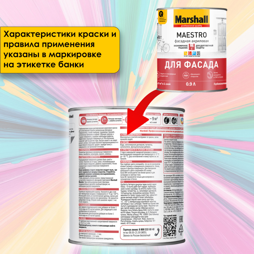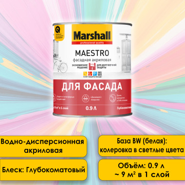 Marshall Maestro фасадная - глубокоматовая водно-дисперсионная краска на акриловой основе для наружных работ. Предназначена для высококачественной отделки минеральных фасадов зданий. Применяется на следующих основаниях: бетон, штукатурка (в том числе и фактурная), кирпичная кладка. Образует высокоукрывистое, паропроницаемое покрытие, устойчивое к атмосферным воздействиям - снегу, дождю, ультрафиолету. Поверхности, окрашенные Marshall Maestro фасадная, имеют высокую износостойкость, превосходные грязе- и водоотталкивающие свойства. Краска легко, без потёков наносится на вертикальные и горизонтальные поверхности, хорошо скрывает небольшие дефекты основания, имеет экономный расход.