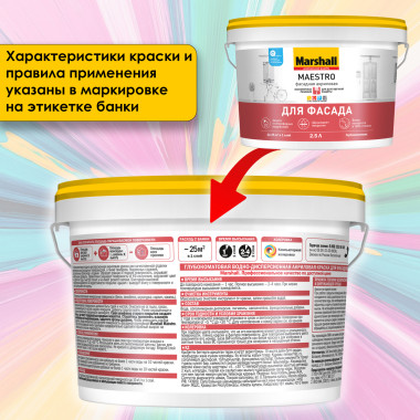 Marshall Maestro фасадная - глубокоматовая водно-дисперсионная краска на акриловой основе для наружных работ. Предназначена для высококачественной отделки минеральных фасадов зданий. Применяется на следующих основаниях: бетон, штукатурка (в том числе и фактурная), кирпичная кладка. Образует высокоукрывистое, паропроницаемое покрытие, устойчивое к атмосферным воздействиям - снегу, дождю, ультрафиолету. Поверхности, окрашенные Marshall Maestro фасадная, имеют высокую износостойкость, превосходные грязе- и водоотталкивающие свойства. Краска легко, без потёков наносится на вертикальные и горизонтальные поверхности, хорошо скрывает небольшие дефекты основания, имеет экономный расход.