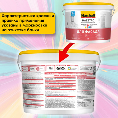 Marshall Maestro фасадная - глубокоматовая водно-дисперсионная краска на акриловой основе для наружных работ. Предназначена для высококачественной отделки минеральных фасадов зданий. Применяется на следующих основаниях: бетон, штукатурка (в том числе и фактурная), кирпичная кладка. Образует высокоукрывистое, паропроницаемое покрытие, устойчивое к атмосферным воздействиям - снегу, дождю, ультрафиолету. Поверхности, окрашенные Marshall Maestro фасадная, имеют высокую износостойкость, превосходные грязе- и водоотталкивающие свойства. Краска легко, без потёков наносится на вертикальные и горизонтальные поверхности, хорошо скрывает небольшие дефекты основания, имеет экономный расход.