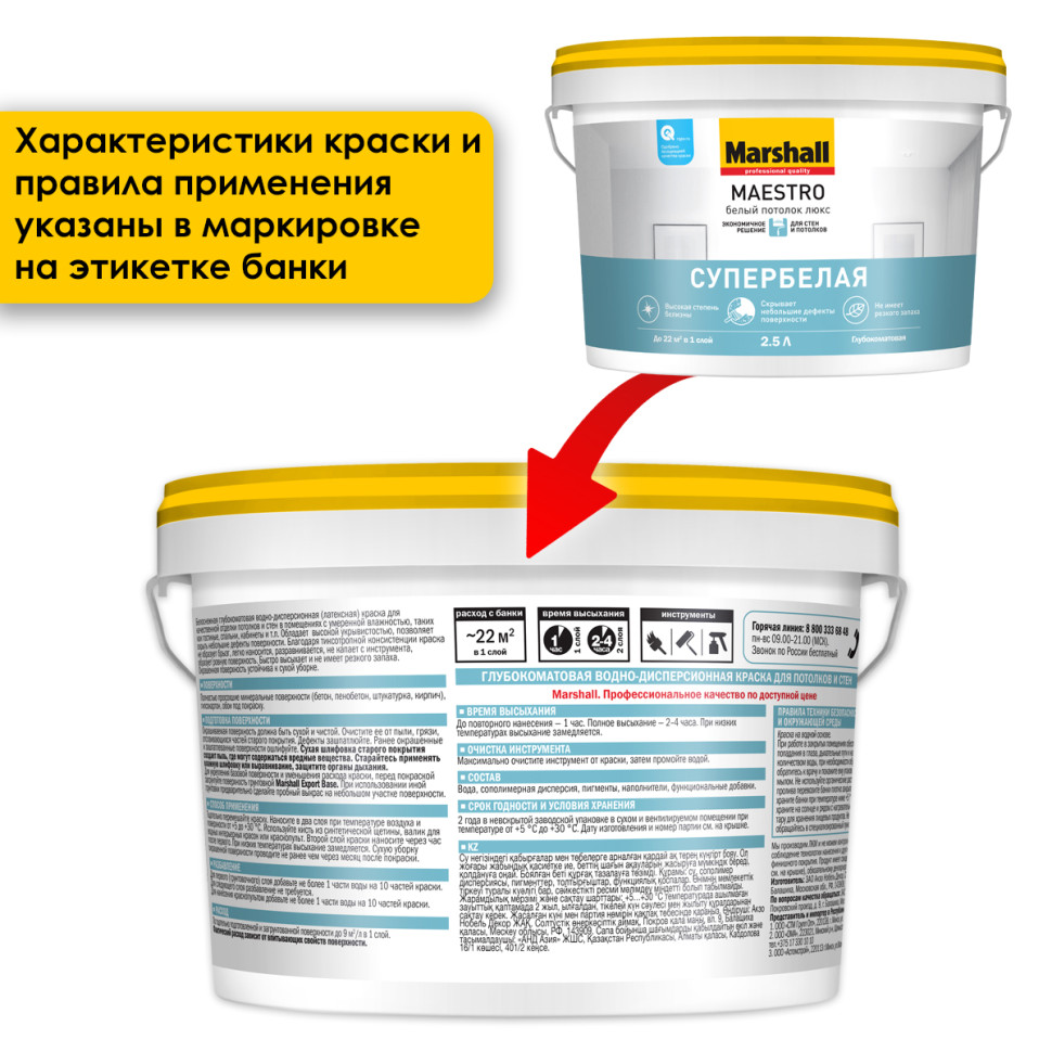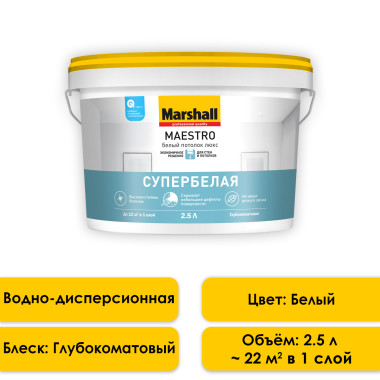 Marshall Maestro Белый Потолок Люкс - глубокоматовая водно-дисперсионная латексная краска для внутренних работ в помещениях с умеренной влажностью. Предназначена для высококачественной отделки потолков и стен, образует покрытие, зрительно выравнивающее поверхность, придавая ему превосходный внешний вид. Наносится на следующие минеральные основания: бетон, оштукатуренные поверхности, кирпич. Краска на водной основе, поэтому не имеет резкого запаха. Maestro Белый Потолок Люкс не образует брызг и потёков, отличается хорошей укрывистостью, что обеспечивает очень экономный расход материала и скрывает мелкие дефекты поверхности.
