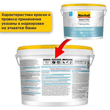 Marshall Maestro Белый Потолок Люкс - глубокоматовая водно-дисперсионная латексная краска для внутренних работ в помещениях с умеренной влажностью. Предназначена для высококачественной отделки потолков и стен, образует покрытие, зрительно выравнивающее поверхность, придавая ему превосходный внешний вид. Наносится на следующие минеральные основания: бетон, оштукатуренные поверхности, кирпич. Краска на водной основе, поэтому не имеет резкого запаха. Maestro Белый Потолок Люкс не образует брызг и потёков, отличается хорошей укрывистостью, что обеспечивает очень экономный расход материала и скрывает мелкие дефекты поверхности.
