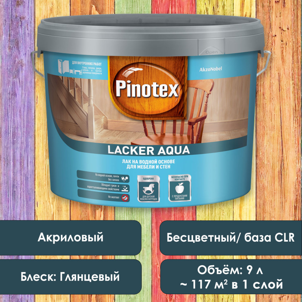 Pinotex Lacker Aqua - лак на водной основе (эмульсия акрилового полимера), предназначен для обработки деревянных поверхностей в помещениях с умеренной влажностью. Создаёт идеально гладкое, эластичное покрытие, устойчивое к царапинам и ударам, а также к воздействию воды, бытовой химии, жира, грязи. Годен для покрытия мебели, стен, карнизов, дверей, детской мебели и игрушек, сертифицирован для защиты поверхностей, контактирующих с продуктами питания - столешниц, деревянной посуды. Может использоваться для лакировки минеральных оснований (бетон, кирпич, камень) для защиты от влаги и загрязнений. Не применяется для лакировки полов! Поверхности, обработанные лаком Pinotex Lacker Aqua, выдерживают воздействие моющих средств, не желтеют и не темнеют со временем. Лак экологически безопасен, не имеет резкого запаха, легко, без потёков наносится и быстро высыхает - отделочные работы можно завершить за 1 день.