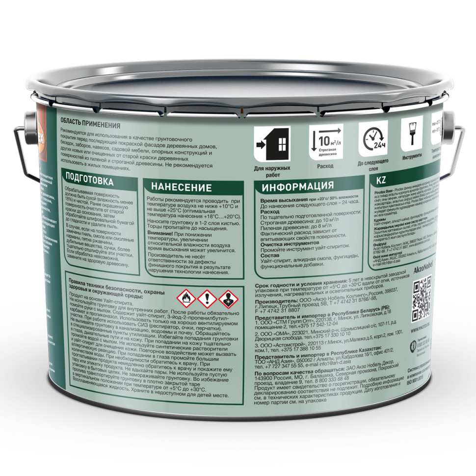 Грунтовка Pinotex Base поставляется в вёдрах объёмом 9 л, рекомендуется нанесение в 1-2 слоя с помощью кисти с натуральным или смешанным ворсом. Расход зависит от впитывающей способности поверхности и составляет: до 10 кв.м/л по строганой древесине и до 8 кв.м/л по пилёной древесине. Ведра объёмом 9 л хватит на покрытие площади до 90 кв.м. Перед применением грунта-антисептика необходимо очистить поверхность от гнили, смолы, пятен ржавчины, отшлифовать и удалить пыль. При нанесении материала рекомендуется особенно тщательно пропитывать торцы древесины.