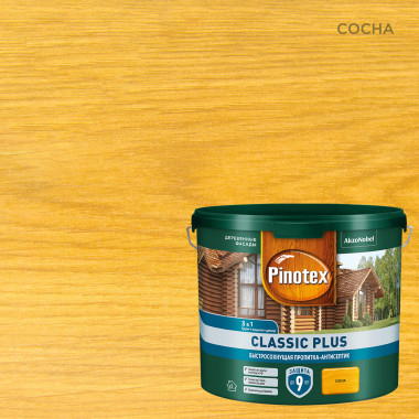 Pinotex Classic Plus 3в1 - пропитка-антисептик на гибридном связующем (акриловый сополимер и алкидная эмульсия). Сочетает в себе свойства трёх материалов: грунтовки, защитной пропитки и декоративного финишного покрытия. Образует дышащее паропроницаемое покрытие, обладающее превосходной атмосферостойкостью. Содержит уф-фильтр, уф-абсорбер, воск, и специальные добавки, защищающие от плесени и влаги. Пропитка Pinotex Classic Plus применяется для обработки бревенчатых фасадов, строений из бруса, полукруглых профилей, вагонки, а также других деревянных вертикальных поверхностей вне помещения. Рекомендована для отделки древесины лиственных и хвойных пород, акцентируя внимание на структуре и рисунке деревянной поверхности. Имеет полуматовый блеск, чем насыщеннее цвет покрытия, тем сильнее выражены его защитные свойства. На водной основе, не имеет запаха, легко наносится и быстро сохнет.