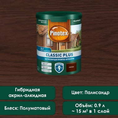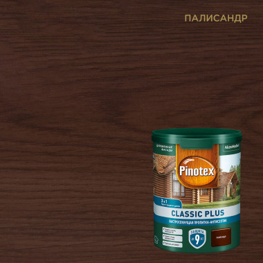 Pinotex Classic Plus 3в1 - пропитка-антисептик на гибридном связующем (акриловый сополимер и алкидная эмульсия). Сочетает в себе свойства трёх материалов: грунтовки, защитной пропитки и декоративного финишного покрытия. Образует дышащее паропроницаемое покрытие, обладающее превосходной атмосферостойкостью. Содержит уф-фильтр, уф-абсорбер, воск, и специальные добавки, защищающие от плесени и влаги. Пропитка Pinotex Classic Plus применяется для обработки бревенчатых фасадов, строений из бруса, полукруглых профилей, вагонки, а также других деревянных вертикальных поверхностей вне помещения. Рекомендована для отделки древесины лиственных и хвойных пород, акцентируя внимание на структуре и рисунке деревянной поверхности. Имеет полуматовый блеск, чем насыщеннее цвет покрытия, тем сильнее выражены его защитные свойства. На водной основе, не имеет запаха, легко наносится и быстро сохнет.