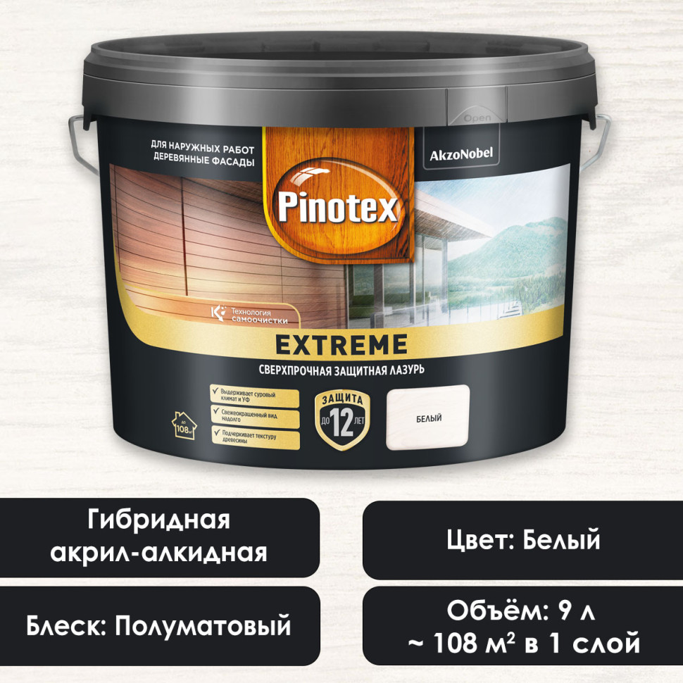 Pinotex Extreme - сверхпрочная лазурь для защиты древесины на гибридном связующем (акриловый сополимер и алкидная эмульсия). Предназначена для обработки деревянных поверхностей в суровых климатических условиях - образует прочное и эластичное покрытие, которое надёжно защищает фасады до 12 лет. При производстве материала реализована уникальная технология самоочистки - грязь не впитывается в древесину, а смывается дождём, поверхность надолго сохраняет свежеокрашенный вид. Содержит уф-фильтр, уф-абсорберы и специальные добавки, защищающие от плесени и синевы. Лазурь Extreme применяется для обработки бревенчатых фасадов, строений из бруса, полукруглых профилей, вагонки, а также других деревянных вертикальных поверхностей вне помещения. Рекомендована для отделки древесины лиственных и хвойных пород, подчёркивает структуру и рисунок деревянной поверхности, имеет полуматовый блеск. На водной основе, почти не пахнет, легко наносится и быстро сохнет.