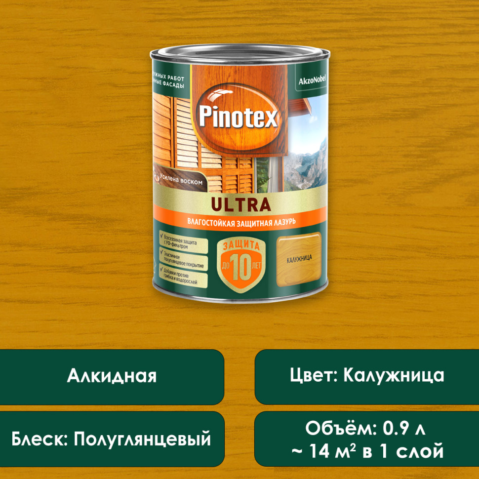 Pinotex Ultra - влагостойкая защитная лазурь на алкидной основе. Образует прочное, эластичное покрытие, устойчивое к образованию трещин, обладающее водо- и грязеотталкивающими свойствами. Содержит уф-фильтр, воск, льняное масло и специальные добавки, препятствующие появлению плесени и грибковых заражений. Лазурь Pinotex Ultra применяется для обработки бревенчатых фасадов, строений из бруса, полукруглых профилей, вагонки, а также других деревянных вертикальных поверхностей вне помещения. Рекомендована для отделки древесины лиственных и хвойных пород, не скрывает структуру и рисунок деревянной поверхности, имеет полуглянцевый блеск.