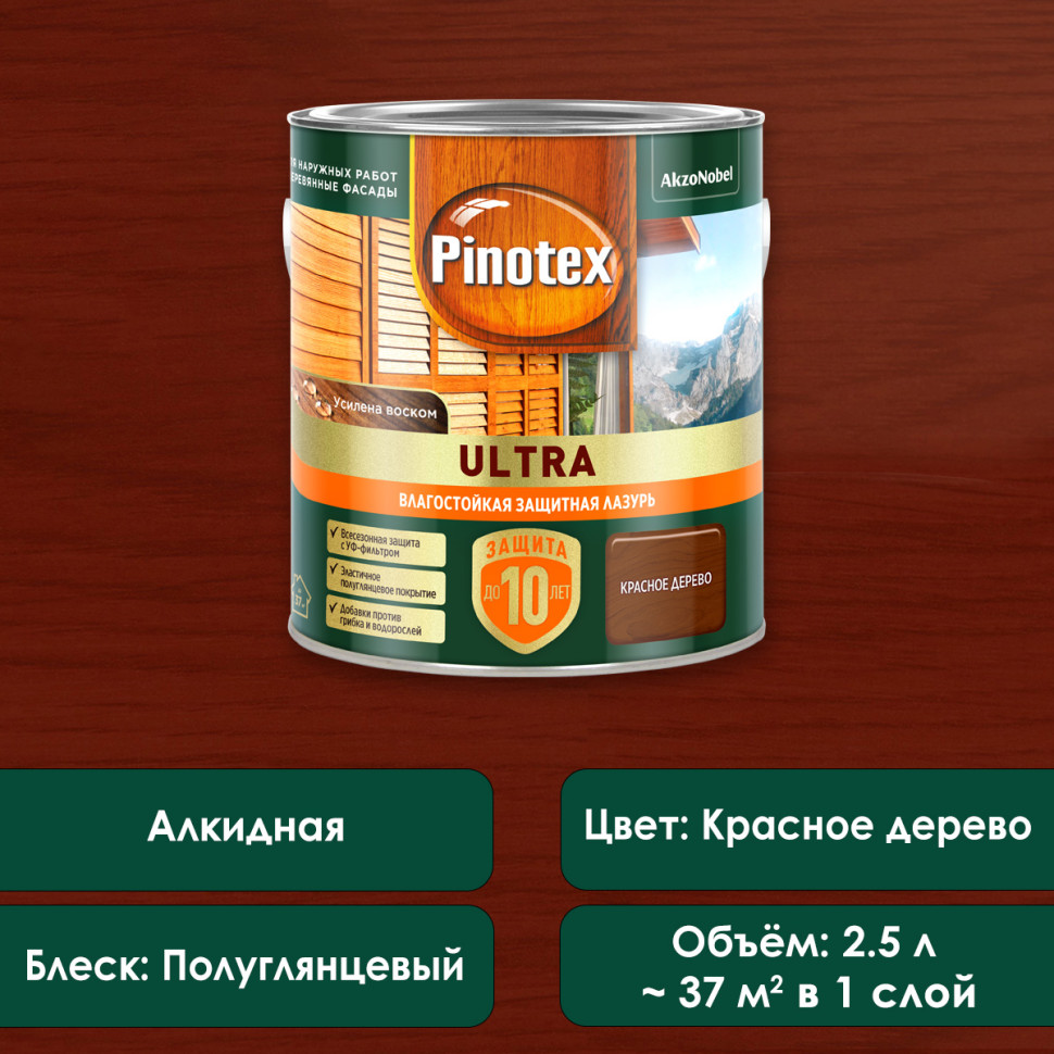 Декоративная лазурь для защиты древесины Pinotex Ultra красное дерево ведро 2.5 л