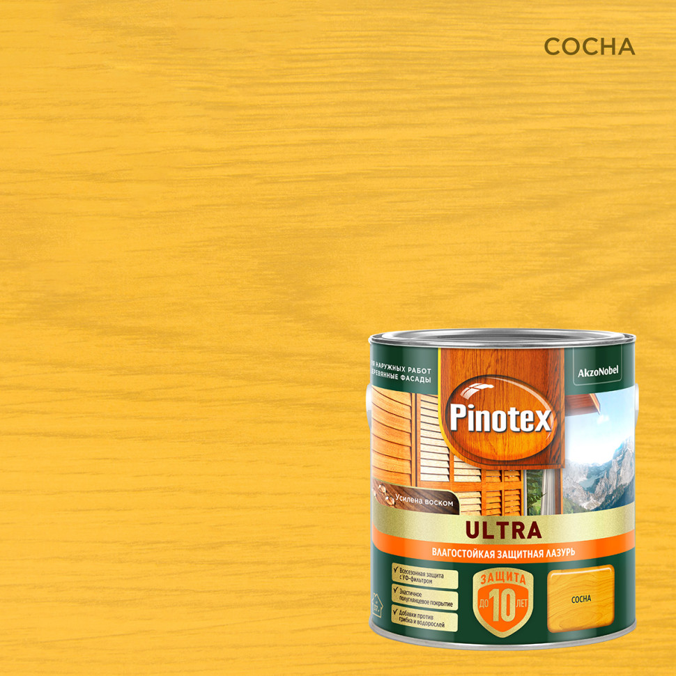 Pinotex Ultra - влагостойкая защитная лазурь на алкидной основе. Образует прочное, эластичное покрытие, устойчивое к образованию трещин, обладающее водо- и грязеотталкивающими свойствами. Содержит уф-фильтр, воск, льняное масло и специальные добавки, препятствующие появлению плесени и грибковых заражений. Лазурь Pinotex Ultra применяется для обработки бревенчатых фасадов, строений из бруса, полукруглых профилей, вагонки, а также других деревянных вертикальных поверхностей вне помещения. Рекомендована для отделки древесины лиственных и хвойных пород, не скрывает структуру и рисунок деревянной поверхности, имеет полуглянцевый блеск.