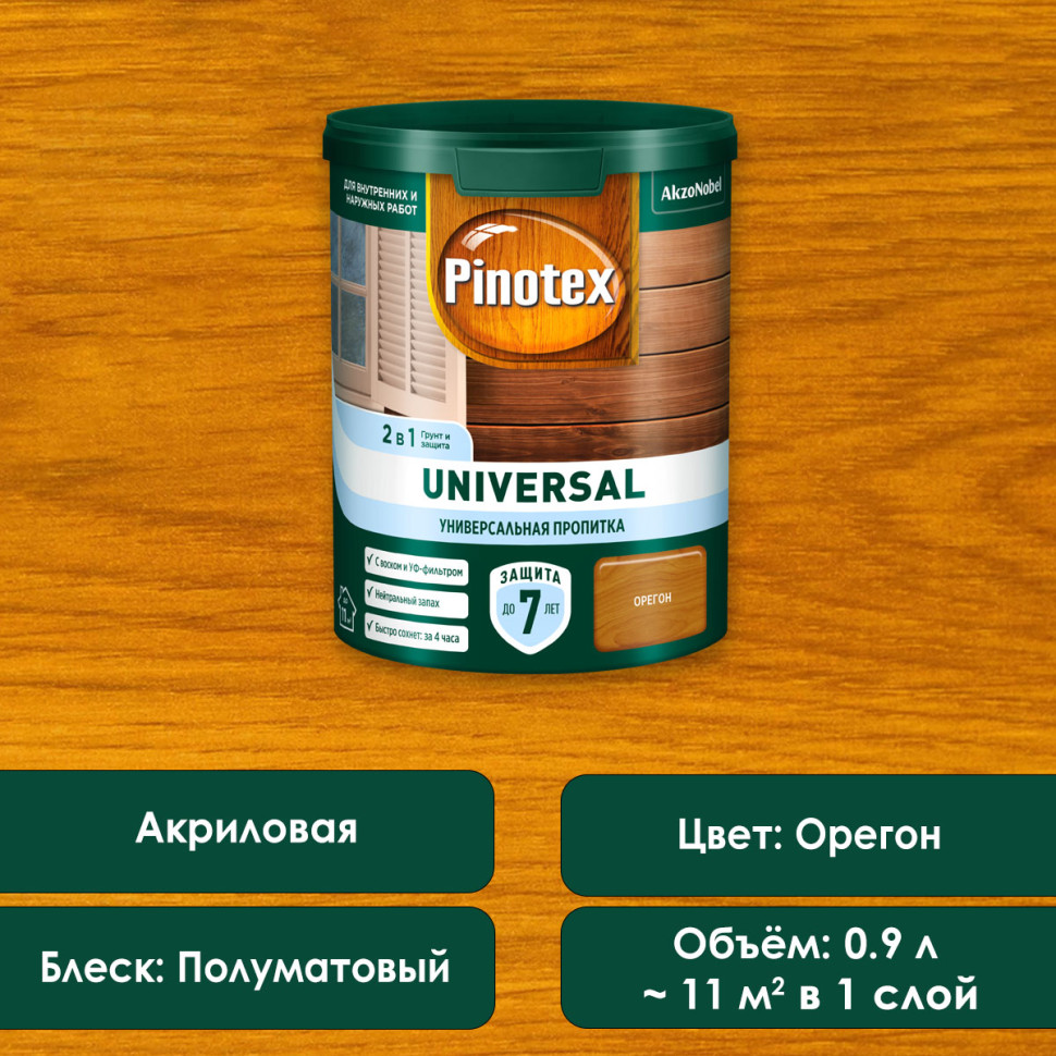 Pinotex Universal 2в1 - универсальная защитная пропитка на водной основе (дисперсия акрилового сополимера). Сочетает в себе свойства двух материалов: грунтовки защитной пропитки. Образует дышащее паропроницаемое покрытие, обладающее хорошей атмосферостойкостью. Содержит уф-фильтр для защиты поверхности от выгорания, воск и функциональные добавки, защищающие от влаги и загрязнений. Пропитка Pinotex Universal 2в1 имеет полуматовый блеск, сохраняет рисунок и фактуру дерева. Применяется для обработки древесины снаружи и внутри помещений - бревенчатых фасадов, беседок из бруса, скамеек, окон, дверей, стен и потолков, мебели. На водной основе, имеет нейтральный запах, легко наносится и быстро сохнет.