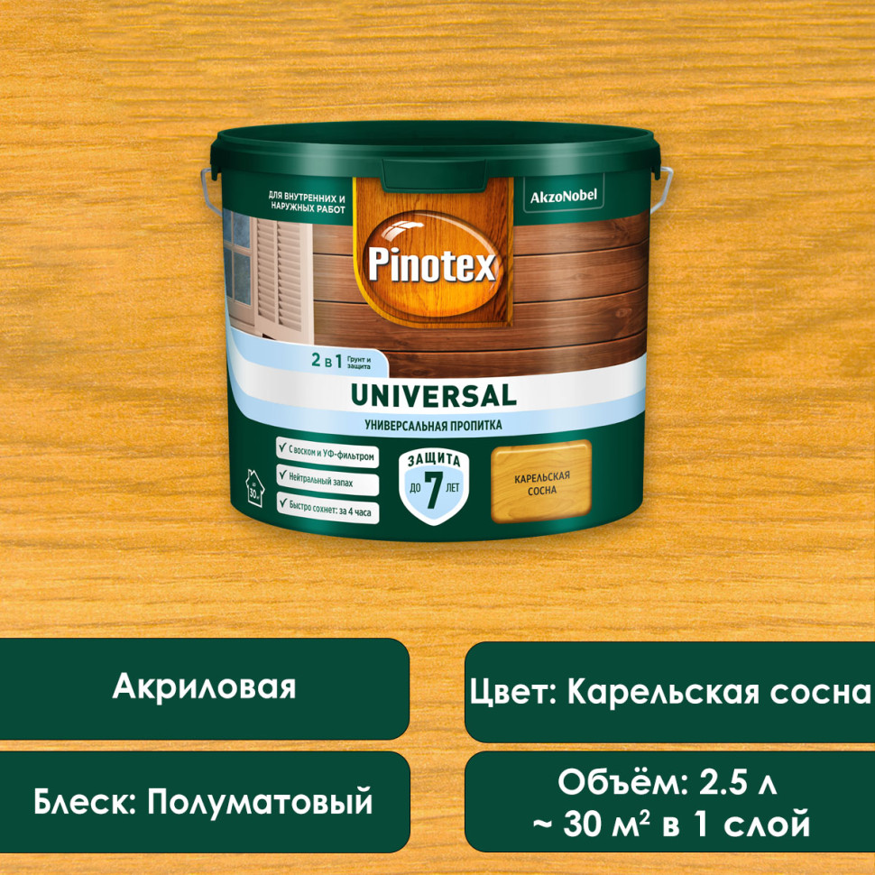 Pinotex Universal 2в1 - универсальная защитная пропитка на водной основе (дисперсия акрилового сополимера). Сочетает в себе свойства двух материалов: грунтовки защитной пропитки. Образует дышащее паропроницаемое покрытие, обладающее хорошей атмосферостойкостью. Содержит уф-фильтр для защиты поверхности от выгорания, воск и функциональные добавки, защищающие от влаги и загрязнений. Пропитка Pinotex Universal 2в1 имеет полуматовый блеск, сохраняет рисунок и фактуру дерева. Применяется для обработки древесины снаружи и внутри помещений - бревенчатых фасадов, беседок из бруса, скамеек, окон, дверей, стен и потолков, мебели. На водной основе, имеет нейтральный запах, легко наносится и быстро сохнет.