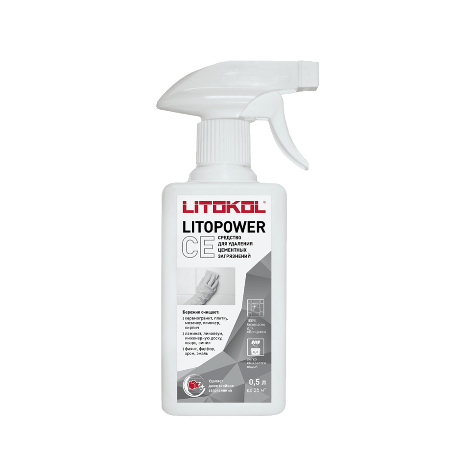Очищающее средство Litokol Litopower CE поставляется в пластиковых флаконах с распылителем объёмом 0.5 л. Расход зависит от поверхности и сложности загрязнений и составляет 20-100 г/кв.м.