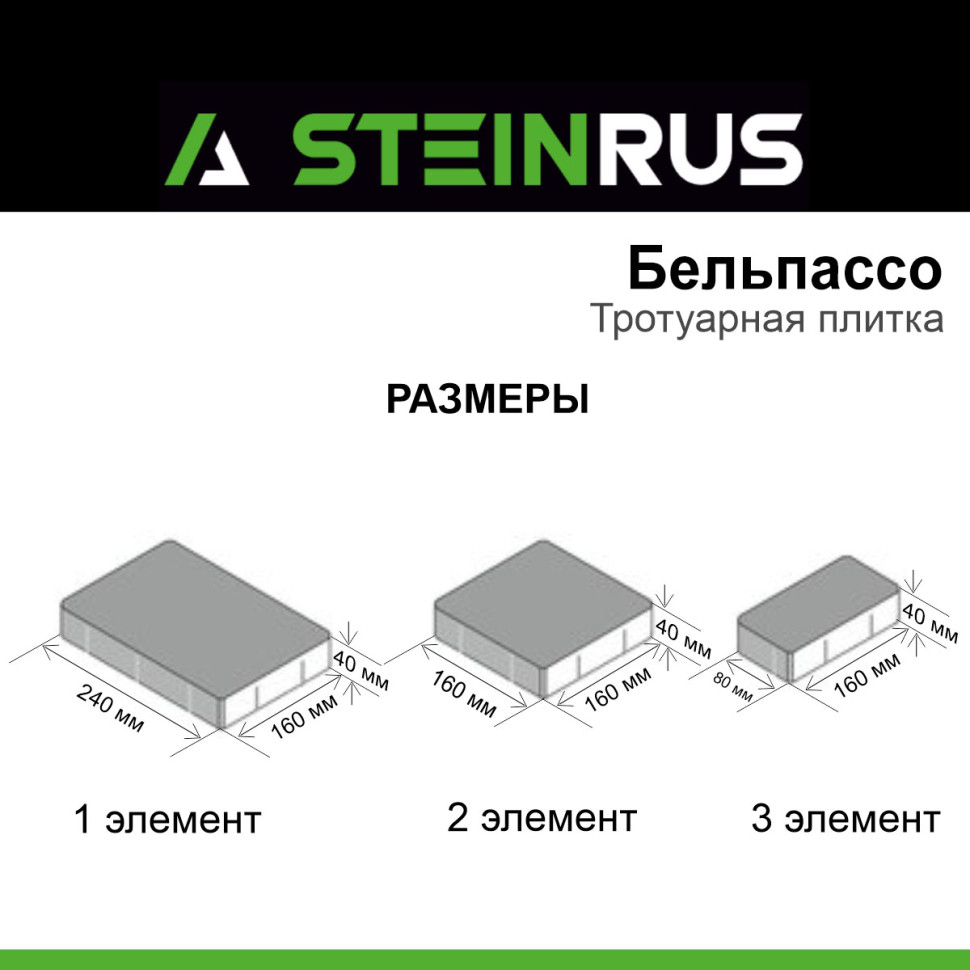 Тротуарная плитка STEINRUS серии Бельпассо - набор трёх разноразмерных камней правильной геометрической формы - прямоугольных и квадратных. Мультиформатность коллекции даёт возможность применения разнообразных схем мощения - от рядовой в разбежку до создания уникальных мозаичных рисунков, а сочетание бетонной брусчатки различных цветов и фактур расширяет границы дизайнерских решений в благоустройстве городского ландшафта и частных территорий. Коллекция применяется при мощении пешеходных зон - дорожек и тротуаров в парках, востребована при обустройстве придомовых территорий загородных коттеджей.