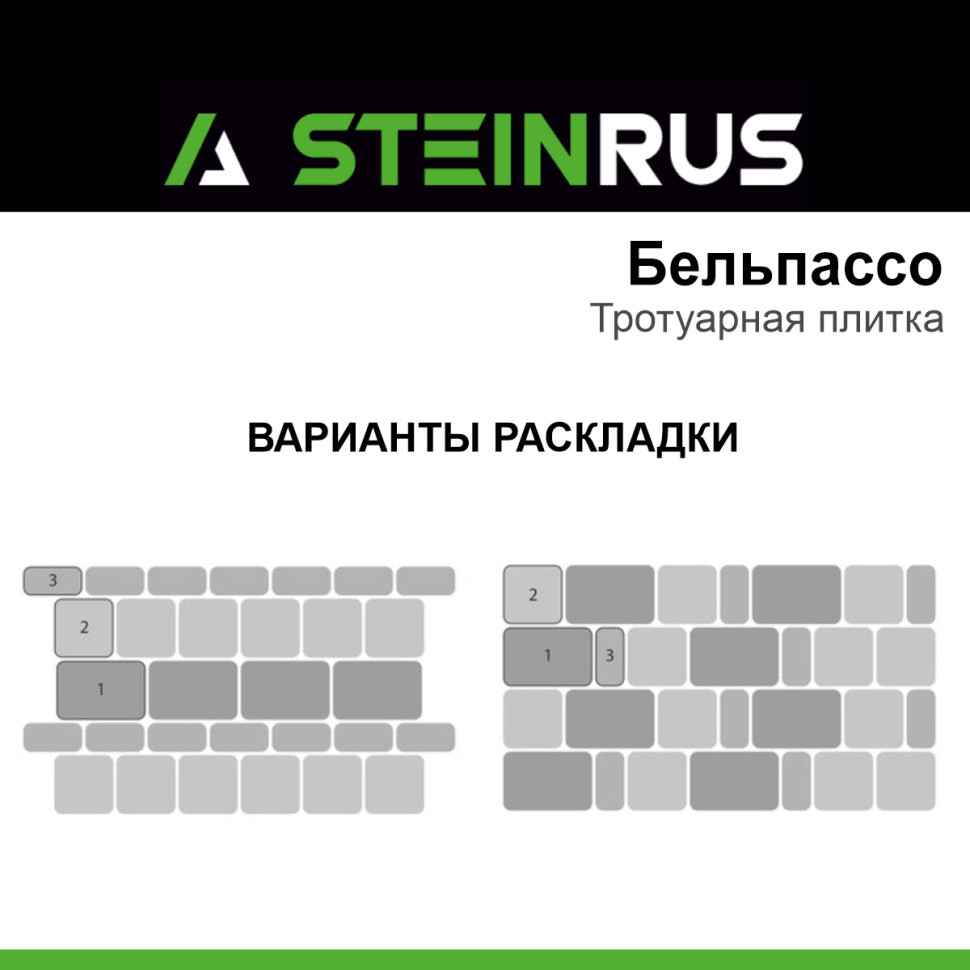 Тротуарная плитка STEINRUS серии Бельпассо - набор трёх разноразмерных камней правильной геометрической формы - прямоугольных и квадратных. Мультиформатность коллекции даёт возможность применения разнообразных схем мощения - от рядовой в разбежку до создания уникальных мозаичных рисунков, а сочетание бетонной брусчатки различных цветов и фактур расширяет границы дизайнерских решений в благоустройстве городского ландшафта и частных территорий. Коллекция применяется при мощении пешеходных зон - дорожек и тротуаров в парках, востребована при обустройстве придомовых территорий загородных коттеджей.