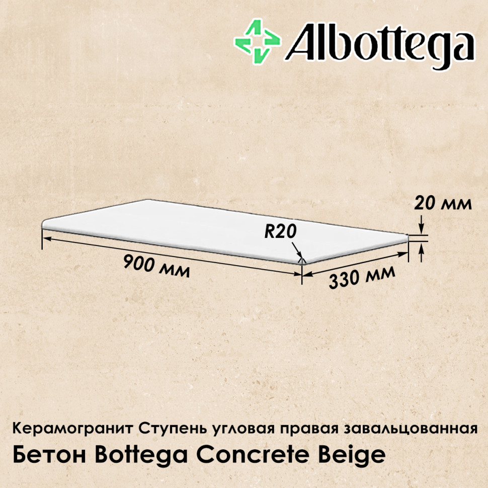 Керамогранитная ступень Albottega коллекции Бетон Bottega Concrete в цвете Beige - насыщенный бежевый с лёгким разнотоном, представлена в формате 90х33 см, где 33 см - глубина ступени, а 90 см - её длина. Толщина ступени 20 мм. Ступень угловая правая (предназначена для оформления лестничной ступени с правой стороны), завальцованная (имеет скруглённый край). Поверхность - неполированная, шероховатая, имитирует бетон, класс противоскольжения R11, что обеспечивает максимальную безопасность на лестницах, в местах, где бывает скопление воды (зоны вокруг бассейнов), а также во время осадков - дождя и снега - при уличном мощении. Коллекция Бетон наиболее востребована при оформлении пространств в стиле Лофт.