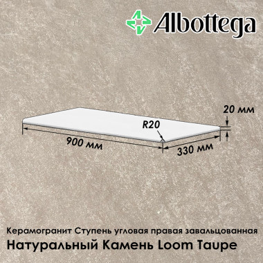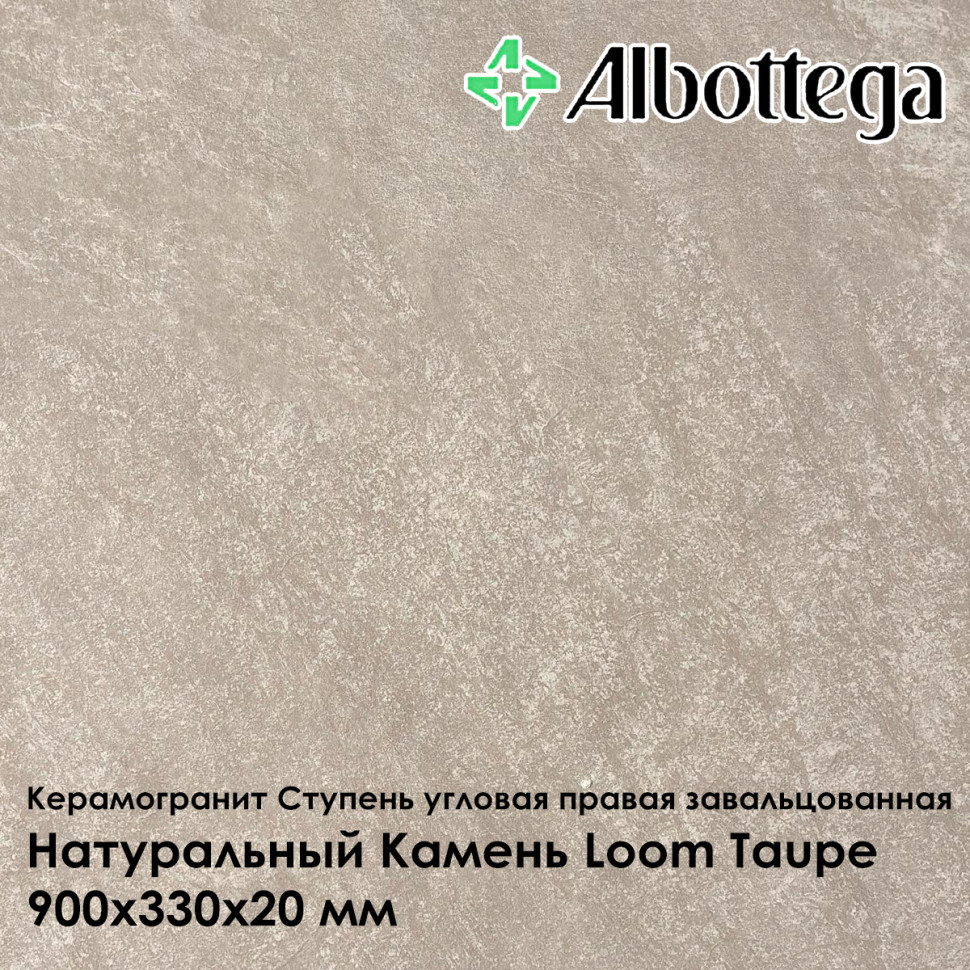 Керамогранитная ступень Albottega коллекции Натуральный Камень Loom в цвете Taupe - серо-бежевый неоднородный с разводами, представлена в формате 90х33 см, где 33 см - глубина ступени, а 90 см - её длина. Толщина ступени 20 мм. Ступень угловая правая (предназначена для оформления лестничной ступени с правой стороны), завальцованная (имеет скруглённый край). Поверхность - неполированная, шероховатая, имитирует фактуру скалы или необработанного камня с трещинками, класс противоскольжения R11, что обеспечивает максимальную безопасность на лестницах, в местах, где бывает скопление воды (зоны вокруг бассейнов), а также во время осадков - дождя и снега - при уличном мощении. Коллекция Натуральный Камень Loom наиболее востребована при оформлении пространств в классическом стиле.