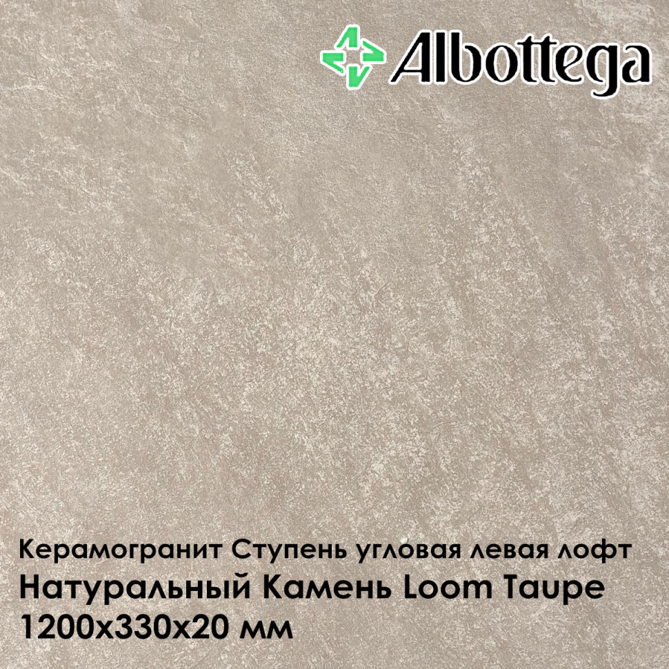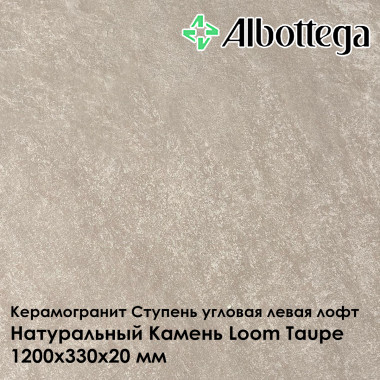 Керамогранитная ступень Albottega коллекции Натуральный Камень Loom в цвете Taupe - серо-бежевый неоднородный с разводами, представлена в формате 120х33 см, где 33 см - глубина ступени, а 120 см - её длина. Толщина ступени 20 мм. Ступень угловая левая (предназначена для оформления лестничной ступени с левой стороны), лофт (имеет прямой капинос). Поверхность - неполированная, шероховатая, имитирует фактуру скалы или необработанного камня с трещинками, класс противоскольжения R11, что обеспечивает максимальную безопасность на лестницах, в местах, где бывает скопление воды (зоны вокруг бассейнов), а также во время осадков - дождя и снега - при уличном мощении. Коллекция Натуральный Камень Loom наиболее востребована при оформлении пространств в классическом стиле.